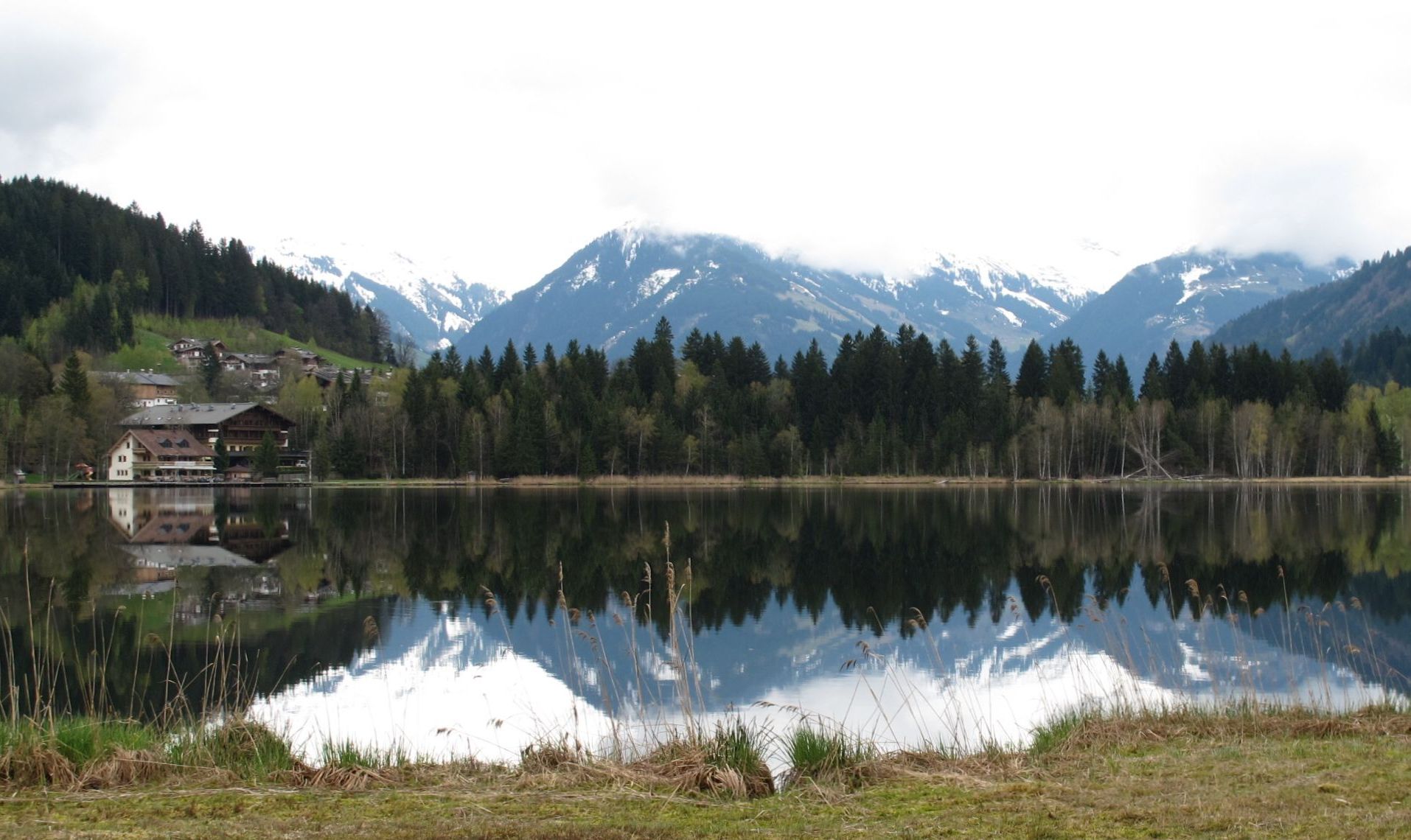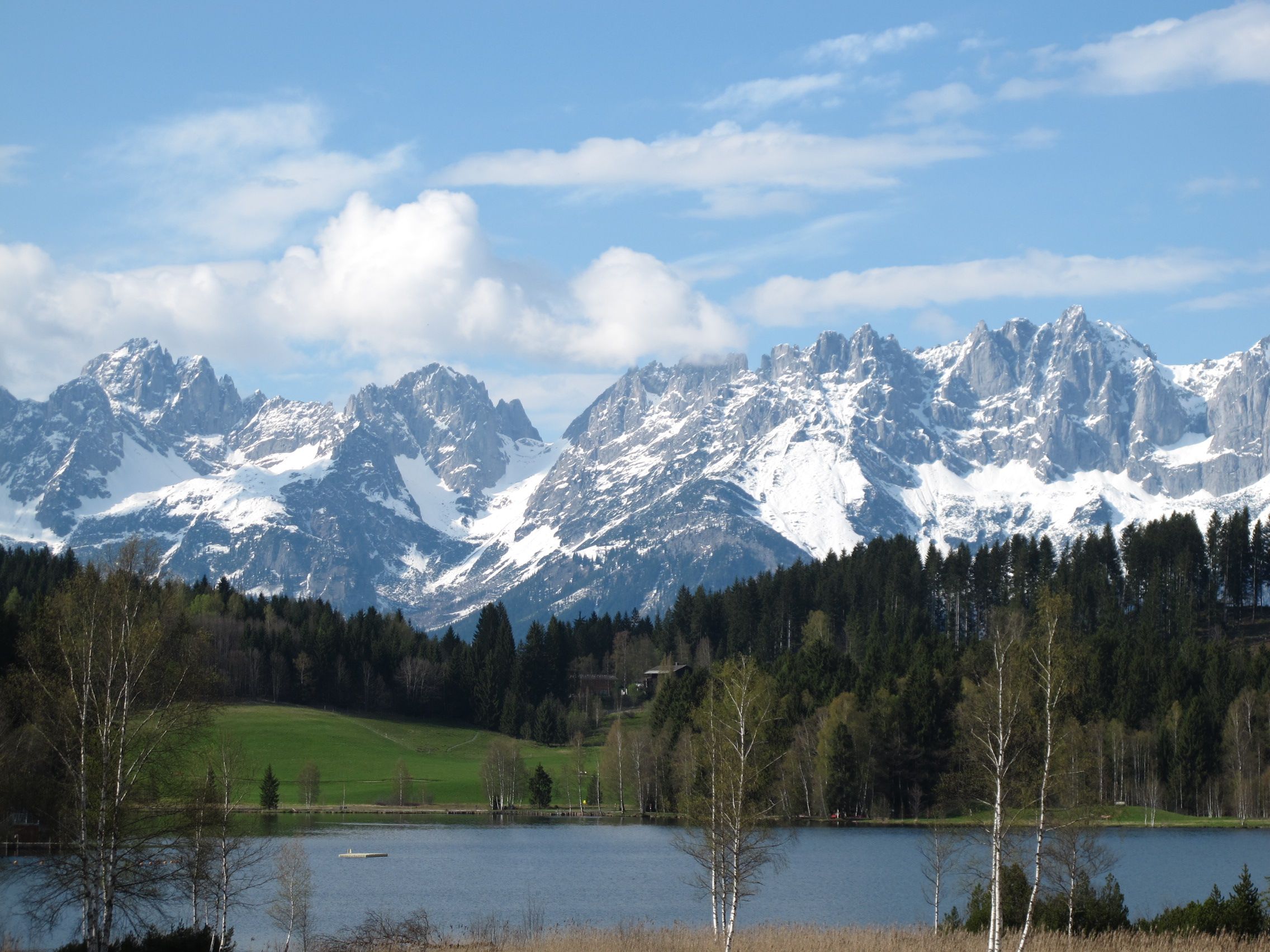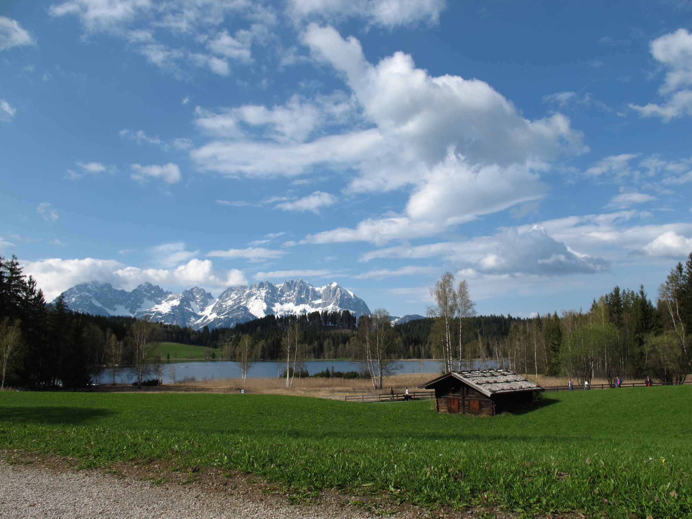 Obwohl die Nacht in der meterdicken Daunendecke eher zu warm als zu kalt ist, sieht der nächste Morgen zunächst frostig aus. Als kurz darauf die Wolken aufreißen und die Sonne ordentlich wärmt, sitze ich bereits auf dem Fahrrad: nur kurz zum Nachbarort, ein paar Alpenleckereien kaufen. Angesichts der Wetterentwicklung dauert der Rückweg fast zwei Stunden, weil die Berge mit abwechslungsreichen Waldwegen und sonniger Bewegung locken. Der Blick auf die weißen Gipfel des Wilden Kaisers über dem Schwarzsee führt einmal mehr vor Augen, was an diesem Winter typisch ist: er findet gleichzeitig mit dem Frühling statt!
