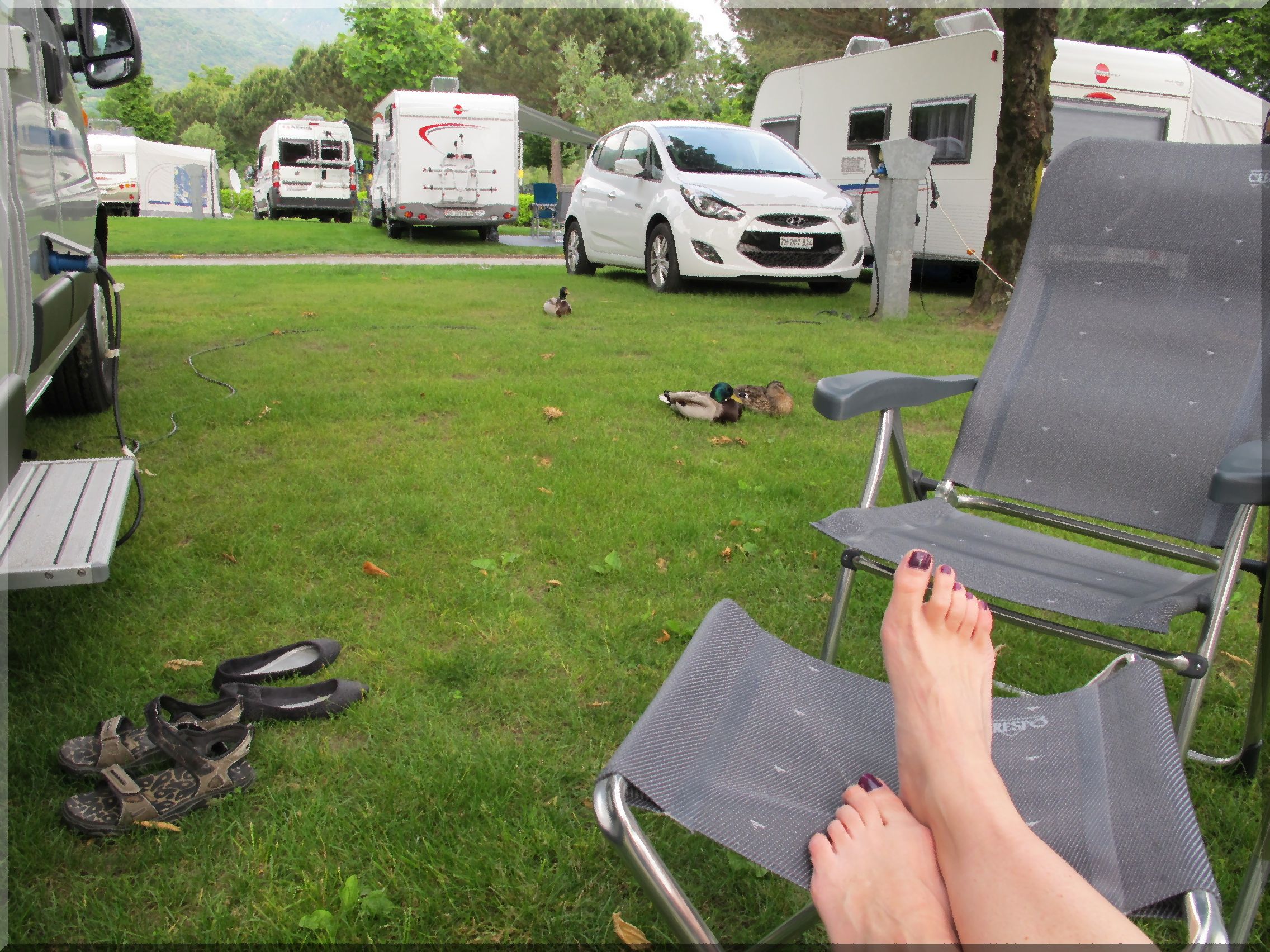 Meanwhile, Switzerland unfolds its landscape as a panorama postcard: rough mountains with snow on top meet green meadows, relaxed cows lazily take their daily sunbath while waterfalls rush down with the force of the entire ski-season melting down. The afternoon takes us to Lago Maggiore, where flying ducks show us the way to „Campo Felice“: located right at the lake and thus being the perfect place for the first common night inside Hector.
