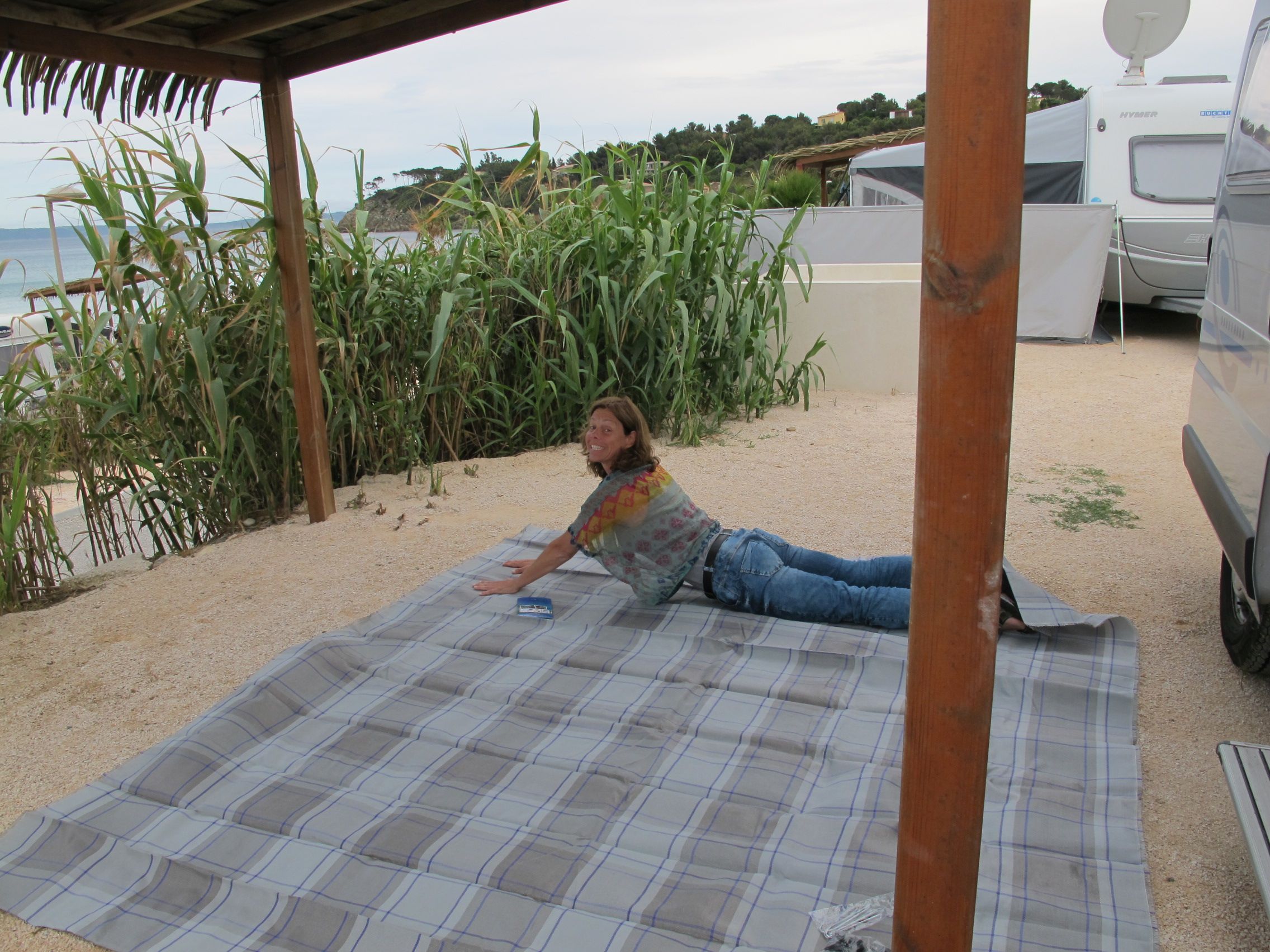 The travel lasts almost the entire day, but the roads lead through beautiful landscapes, so when we finally arrive at the campsite we are totally at ease. For the first minute, that is. Then we start wondering if this has really been a good choice: the campsite is supposed to be located right by the sea, but so far we are deeply within the hills and all we can see is forest, hills, and even more forest on hills. A short look at the map of Camp du Domaine (Borme les Mimosas) shows: we obviously have been underestimating the size of a 111 acres (45 Hektar) campsite: the area is huge and includes pine forest, vineyards, and – in the lower parts – 400m of sandy beach and millions of drops of finest blue water. Moments later, Hector comes to a halt just 30 meters away from the sea, including a wide view on the Côte d’Azur with all shades of deep blue.