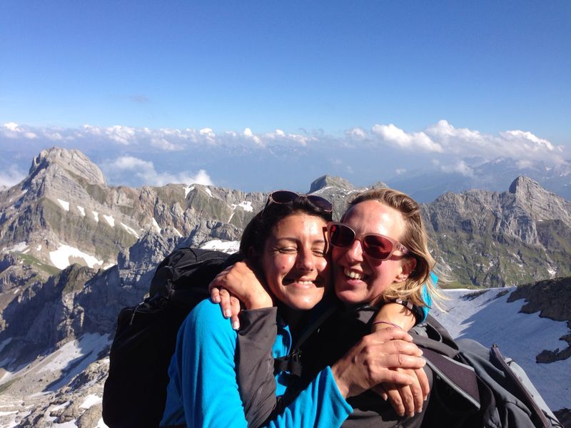 Es ist kalt hier oben und zugig, aber das gleitet an uns ab. Wir schweben auf den Endorphinen der Begeisterung: wir haben es geschafft! Diese Tour!! Mit allen Schwierigkeiten!! Der Säntis ist mit seinen 2.502 m der höchste Punkt weit und breit und so haben wir Weitblick in alle Richtungen. Es ist zu diesig, um den Bodensee klar zu erkennen, aber das Panorama ist dennoch umwerfend. Vor allem der Blick zurück ist der Wahnsinn: da sind wir entlang gekommen. Da unten, weit weg, liegt der Bergsee. Dort der Grat, an dessen Lücke wir auf die andere Seite gewechselt haben. Auch andere Routen sehen wir von hier oben: eine davon führt 2 Stunden am Stück über einen größeren Gletscher, eine andere führt über einen schmalen Grat auf 2.400m Höhe, bei dem es beiderseits schroff in die Tiefe geht – ja, wir glauben gern, dass wir den einfachsten Weg hatten und wir verstehen die Begeisterung für das Wandern am und auf den Säntis. So spannend war noch keine der Wanderungen in meinem Leben und ich war auch noch nie so stolz darauf, einen Gipfel bestiegen zu haben.