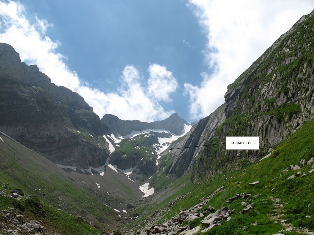 Stoisch überqueren wir Schneefeld über Schneefeld, unterbrochen von felsig-steilen Passagen, bei denen wir wieder froh darum sind, uns mit den Händen zusätzlich halten zu können. Inzwischen entwickelt sich bei uns beiden ein guter Rhythmus und wir fangen an, die Jungs-Wandergruppe vom Bodensee nach und nach zu überholen. Eine gefühlte ganze, tatsächlich jedoch nur halbe Stunde später rückt die Aussichtsterrasse des Säntis so nah, dass wir einzelne Personen ausmachen können und das Klirren der Biergläser zu hören ist. Mein Wander-Ich schaltet auf „Endspurt!“ und Christine zieht lässig mit, so dass wir die Zick-Zack-Serpentinen des letzten Wegstücks kraftvoll in Angriff nehmen. Das Stahlseil funktioniert wie ein Treppengeländer, so dass uns diese als besonders schwierig angepriesene Strecke („absolut schwindelfrei“ angeblich ein Muss) erheblich leichter fällt als der weniger steile, aber sehr freie Abschnitt zwischen Mesmer und Wagenlücke.