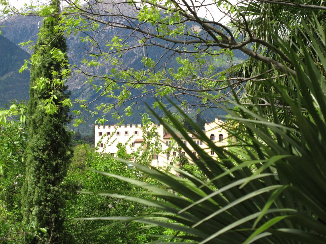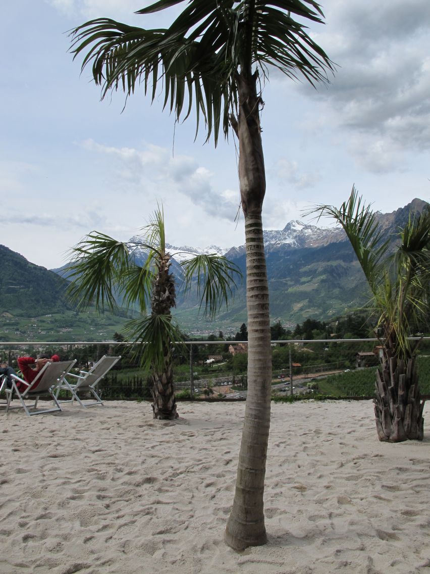 Da körperliches Wohl nicht nur von Bewegung und blütenreichem Augenschmaus abhängt, hole ich mir unten am künstlichen See ein Eis, lasse mich auf der See-Plattform in einen Liegestuhl fallen und genieße meine südtiroler Auszeit. Dieses Gelände hier ist eine unterhaltsame Mischung aus botanischem Garten, Sissi-Andacht, museal aufbereiteter Touristen-Historie, alten und neuen Gebäuden und Aussicht auf Berge und Täler. Wer sich noch nicht die Füße platt gelaufen hat kann ausgehend von den Gärten Trauttmansdorff einen historischen Fußweg nehmen, der ihn sanft zum Zentrum von Meran hinab führt.