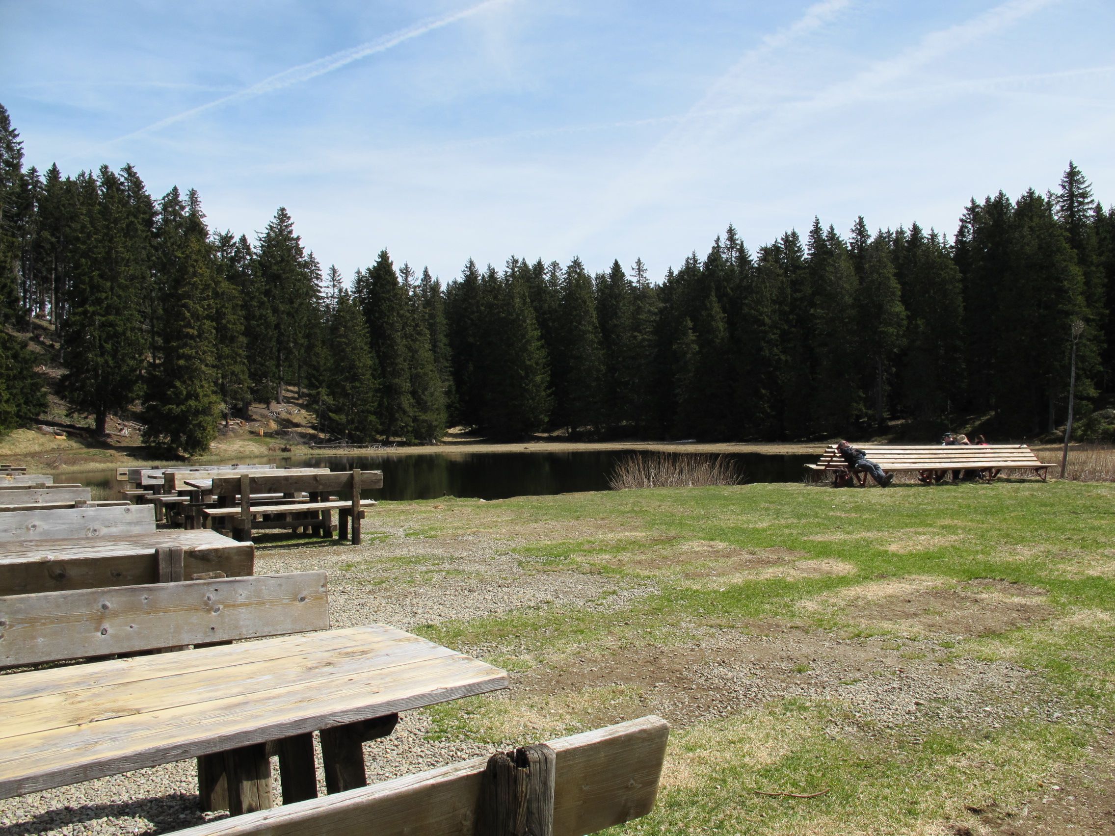 Wie üblich habe ich längst Hunger, aber für die ersten beiden Einkehrmöglichkeiten ist es noch zu früh. Also geht es weiter zur Schwarzen Lacke, einem kleinen Moorsee mit überaus einladender Gastwirtschaft daneben. Entlang der Holzwand der Hauses stehen rustikale Bänke, verstreut sitzen entspannte Wanderer und Radler und die Speisekarte bietet genügend Auswahl, um über 1,5 Stunden verteilt die Beine auszustrecken und im Wechsel süße und deftige Tiroler Gerichte zu sich zu nehmen.