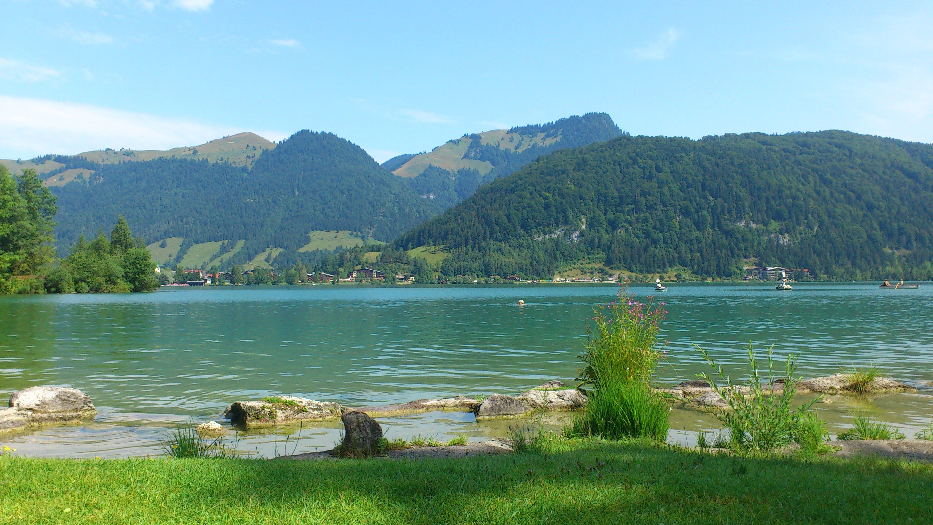 Egal, wer liebevoll kuscheln will, kann sich am Seeufer – vulgo: „campingplatzeigener Badestrand“ – mit den watschelnden Enten anfreunden, die heute gern die Zeitung mit mir teilen wollen. Der See schimmert einladend grün, ist vollständig in Privatbesitz und streng reglementiert: maximal eine gefühlte Handvoll Boote (Schlauchboote, Ruderboote, Elektroboote, Fischerboote) sowie das einzige Wasserskiboot des Sees dürfen gleichzeitig unterwegs sein, jeder Paddler muss daher einen Derfschein (hessisch für „Erlaubnis“) mitführen. Zum Baden ist das prima, weil man weit rausschwimmen kann, ohne um seinen Kopf zu fürchten. Ich liebe das Bergpanorama rund um die Alpenseen, das umso schöner ist, wenn man sich ein paar (hundert) Meter vom Ufer entfernt. Auf den Rücken legen und staunend die Berge betrachten, dann wassertretend die alte Schwimmbrille auf die Augen quetschen und lässig zurück ans Ufer kraulen – klappt inzwischen immer besser.
