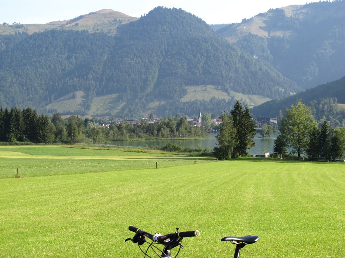 Der Walchsee schimmert grün, die Sonne schickt diesige Strahlen quer in die Landschaft und die Kühe betrachten interessiert meine Mühen, als ich kurz darauf das Fahrrrad über ein winziges Drehkreuz inmitten von Weide-Stacheldraht-Zäunen hebe, was auch fast kratzerfrei gelingt. Zum Glück ist das einzige nicht-fahrbare Stück nur kurz und danach werde ich mit einer langen Abfahrt belohnt.