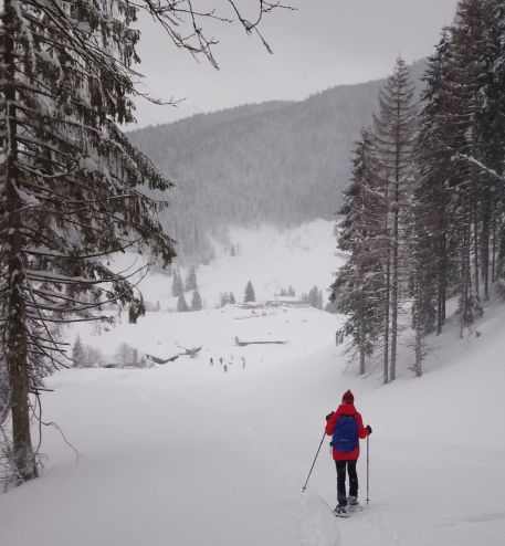 Weather conditions are tricky today, but Barbara, secretly known as Supergirl, brings best spirit with her and thus we go for another snowshoe-tour. The latent danger of avalanches as well as limited sight lead us to the well-known trekking path around the Rosskopf / Spitzingsee.