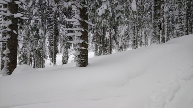 The path in the forest presents our surrounding as a perfect winter-wonderland. Further up with open landscape it becomes much more difficult and that is not only due to the body-check with an ignorant snowboarder. The masses of fresh snow combined with the strong wind are certainly challenging, but we beat it with will, force and laughter.