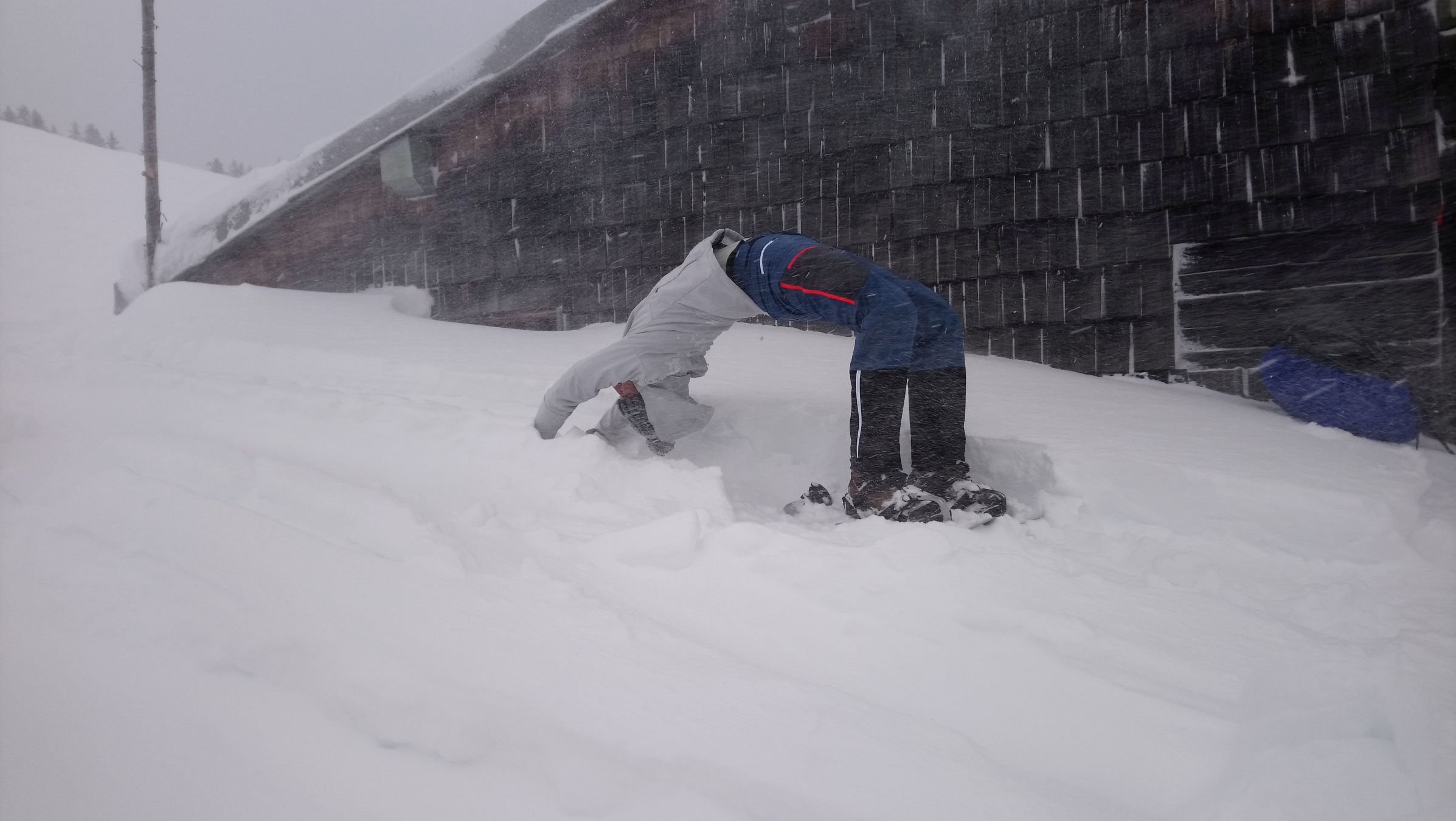 Before we turn around and face the whiteout, we stop for a short rest behind a rural barn. Lucky us that we regained our sinews with hot tea and boarisch Brezn! The path downwards is hardly visible with the wind blowing masses of snow even over fresh traces. We loose the original path several times and fight our way back on solid ground, sinking in the snow up to our hips. It definitely was a good decision to go for a well-known route today.