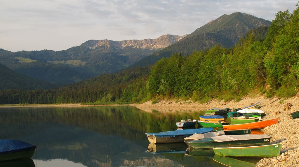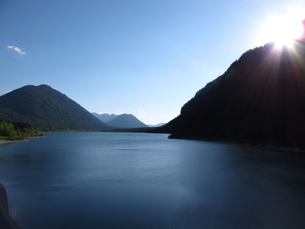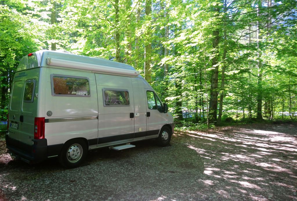 I decide to try it out. Hector, of course, is eager to get out and play. On Wednesday (my favourite holiday-weekday), we head off and an hour later find our spot for the night: The camper parking at Sylvenstein Stausee is open for campers! A nice mixture of vans, RVs, cars with roof-tents and any other possible overnight shelter is dispersed under high trees. The lake shore is a 4-minutes-walk away from Hector’s spot and the sun keeps smiling from an almost cloudless sky.
