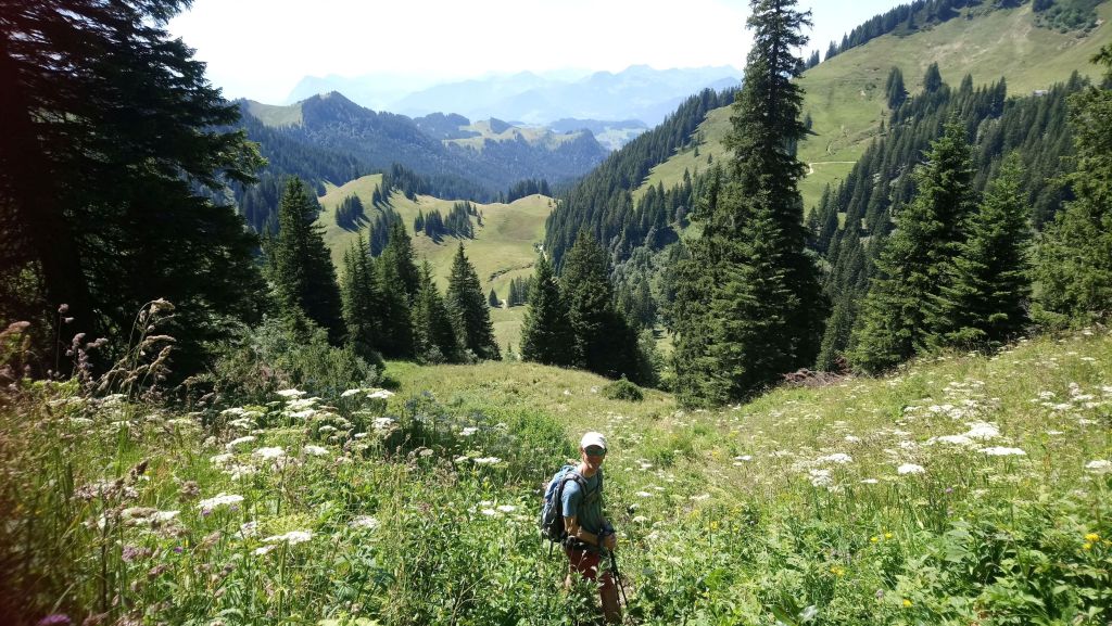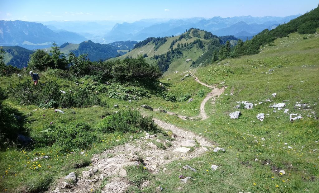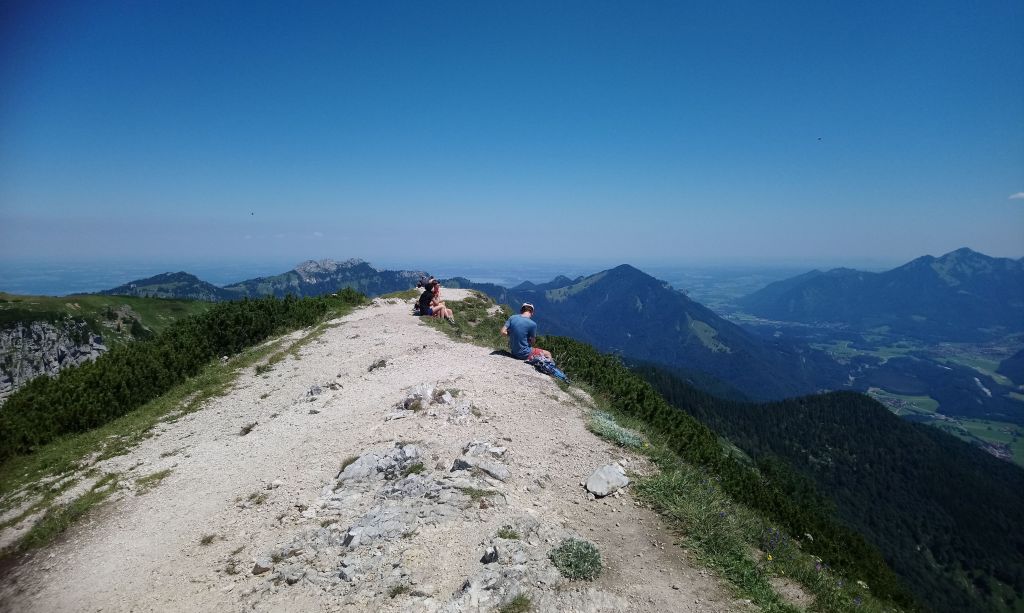 Today’s peak is sort of a ridge with steep flanks on two sides, yet without being bothering. It offers enough space for a hand full of hikers and their peak snack (rewarding Gipfelsemmel), accompanied by a 360° lookout.