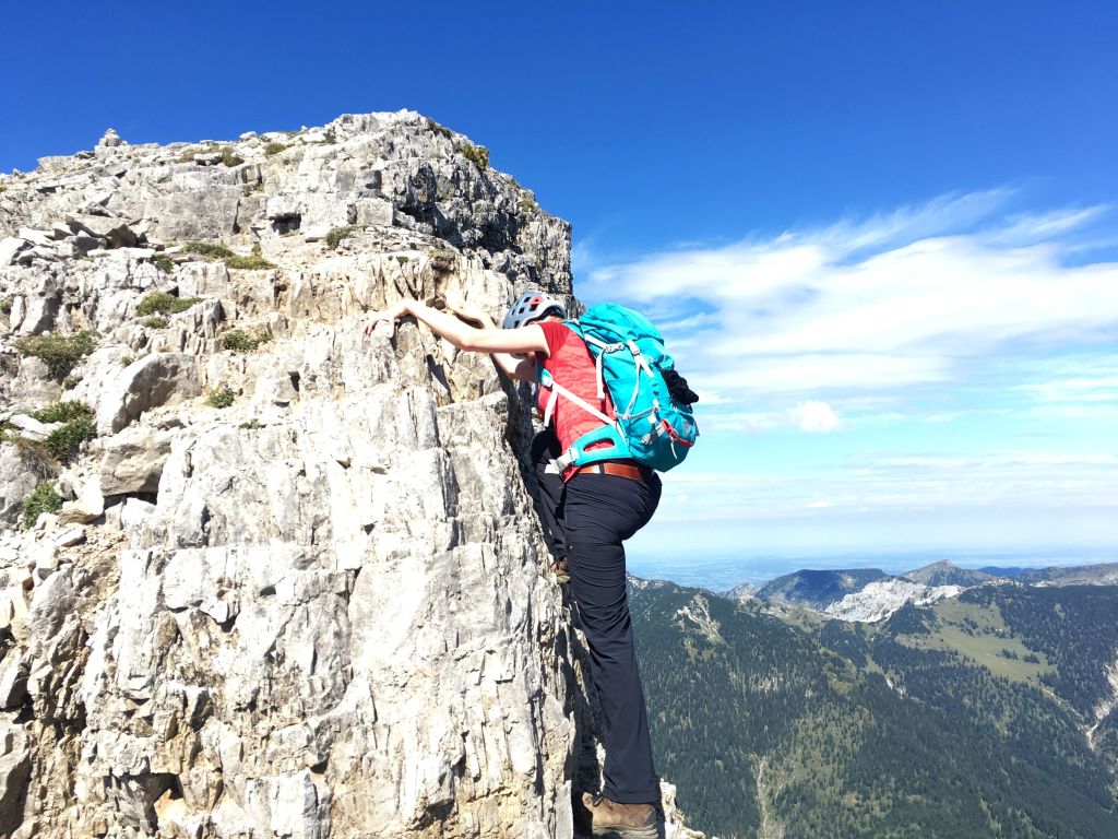 Even I have some doubts if this is the right way and/or if it suits our abilities. Lucky us that 4 youngsters come their way with one of them having experienced the route some years ago. He confirms that the climbing of this tour is much more harmless than the walls beneath our feet. Light-hearted, we follow the know-how-guys to the 3rd peak and find it all easy enough.