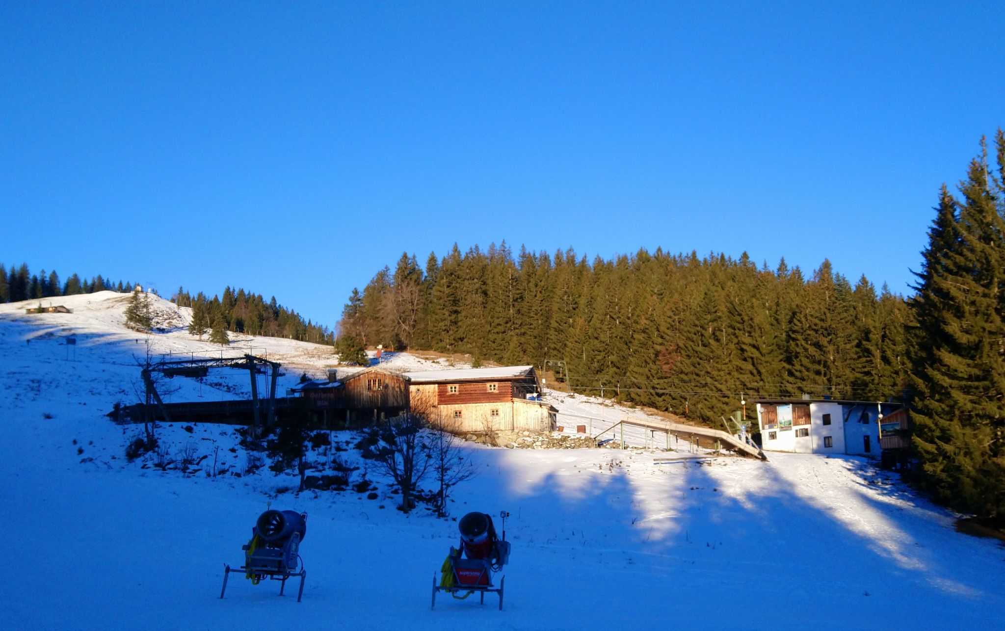 Unterwegs passiere ich diverse Lifte des Skigebiets. Die aufgegondelten Sessel und Bügel hängen so rum, haben aber wenig Drive. Dazwischen stehen Schneekanonen und sehen gelangweilt aus. Was für ein verrücktes Jahr!