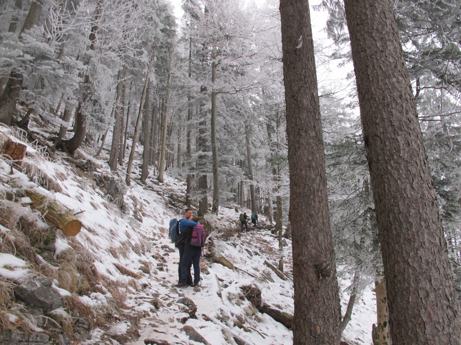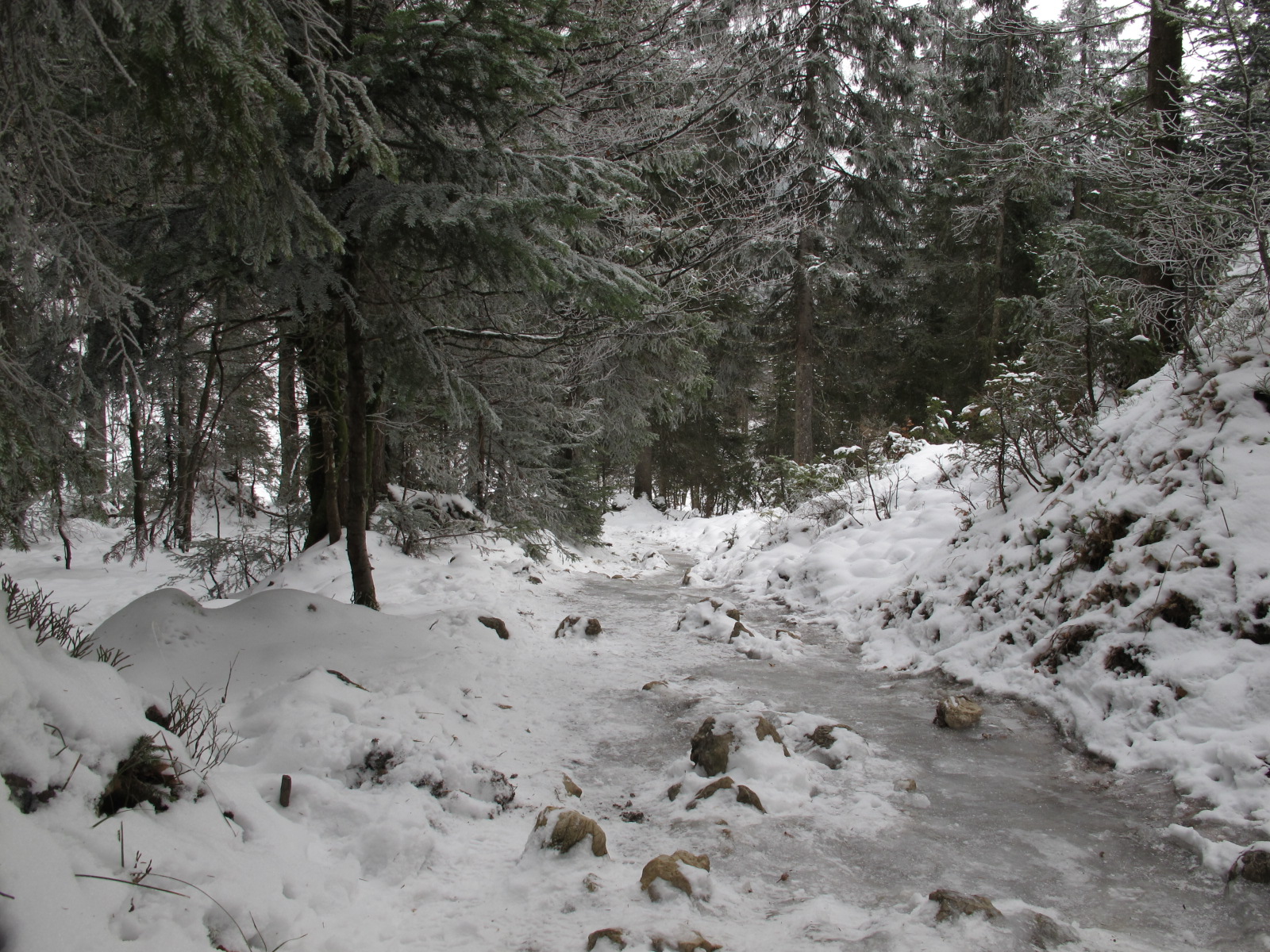 Further down, we cross several streams and icy paths. The picture below shows the latter – did I mention the useful crampons? Natural born chamois might do without, but I only started hiking in my late youth (13 years ago) and appreciate the perfect grip on snow and ice.