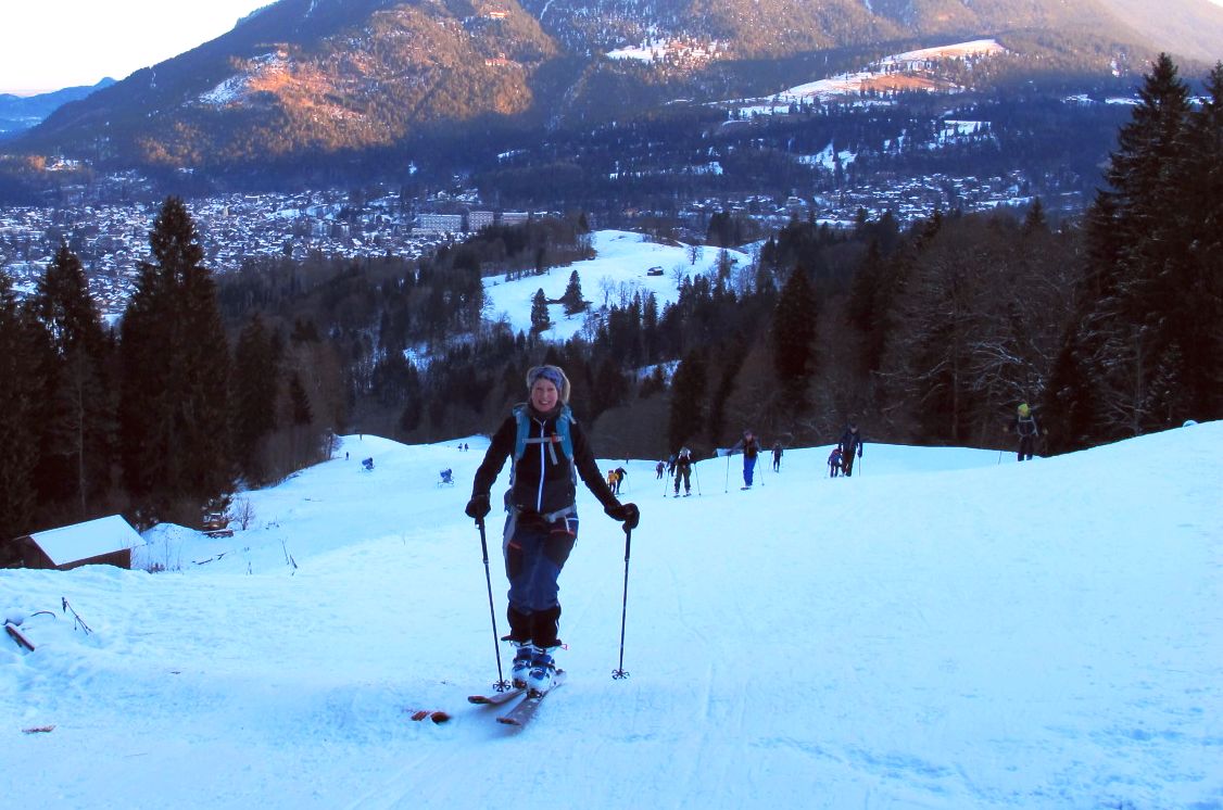 At 7:00 a.m., the mountain silhouettes emerge in first rays of sunrise as I approach Garmisch. I am one of the early birds and feel well-experienced with my touring ski equipment, now that I am up for my second tour.