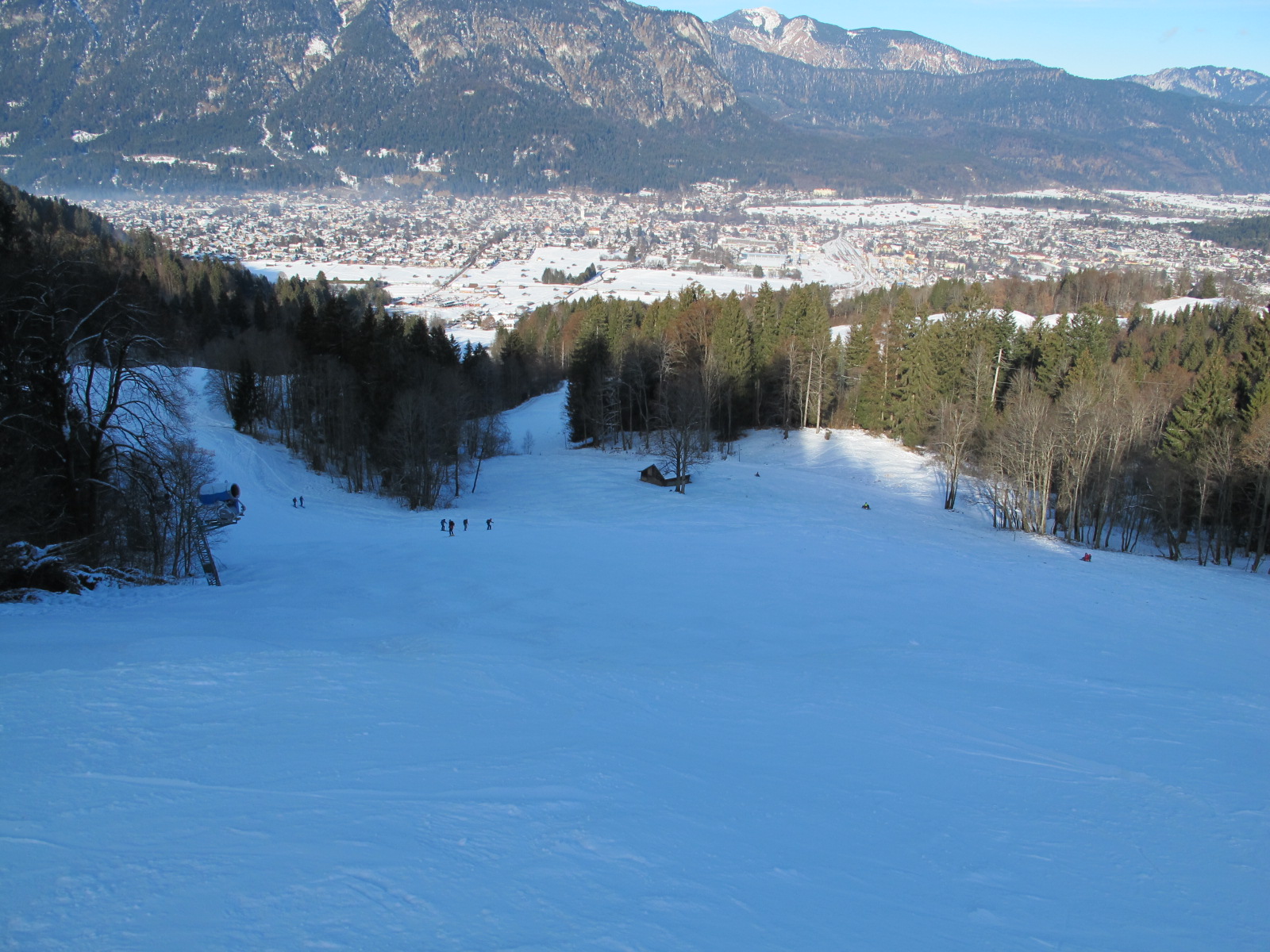 Despite my knowledge of the ski area, I choose the No. 1 slope for my descent. It might be less steep than the No. 2 “Horn-Abfahrt”, but – as usual – the frosty, artificial snow makes the hillsides quite slippy. The light touring skis offer less grip than regular alpine skis, in fact they do not offer any grip on the icy parts at all. At least the conditions turn the one-slope-downhill action into a 30-minutes-event, and I am happy with today’s skiing when I reach the Hausberg valley station, safe and satisfied.