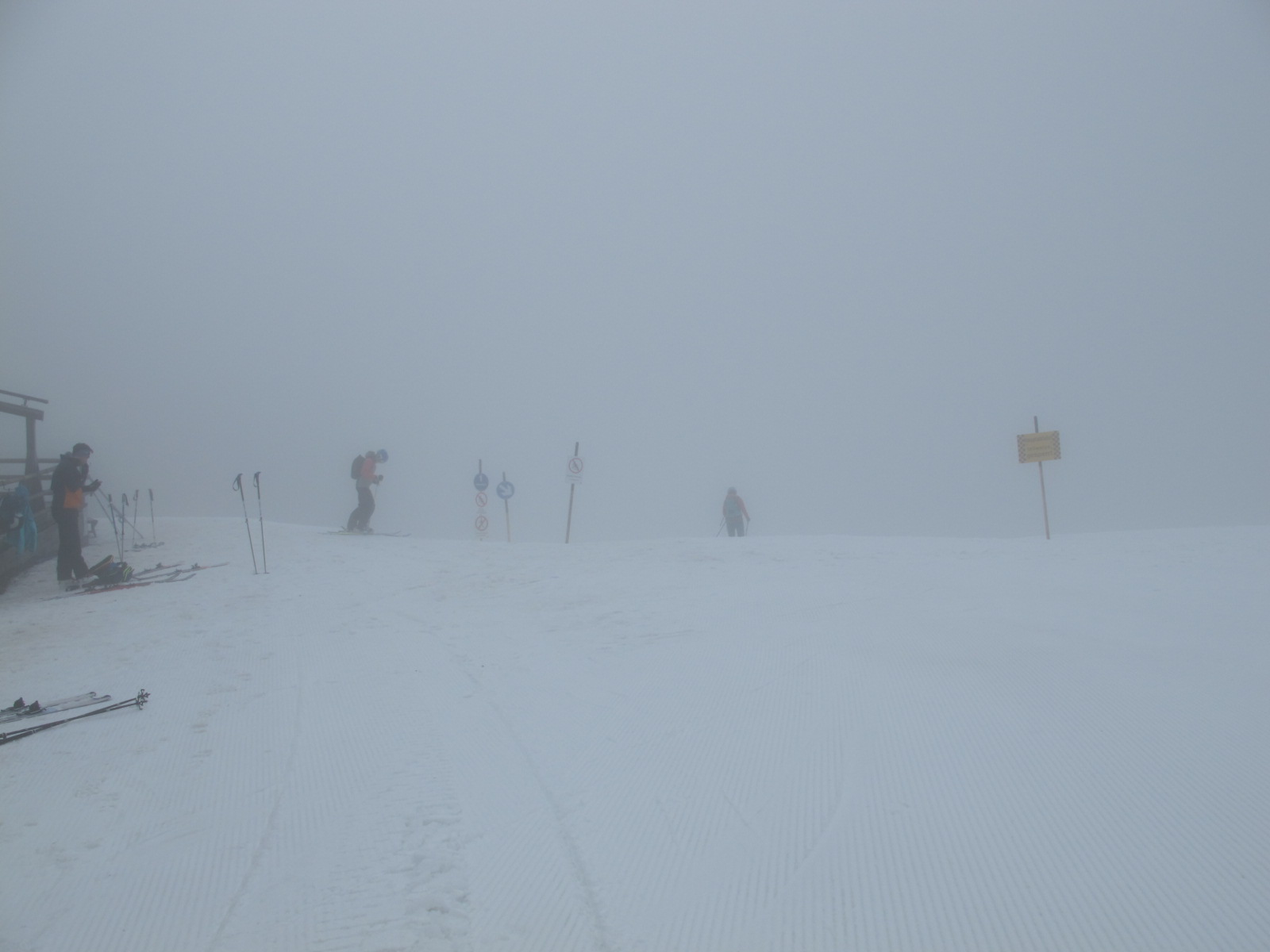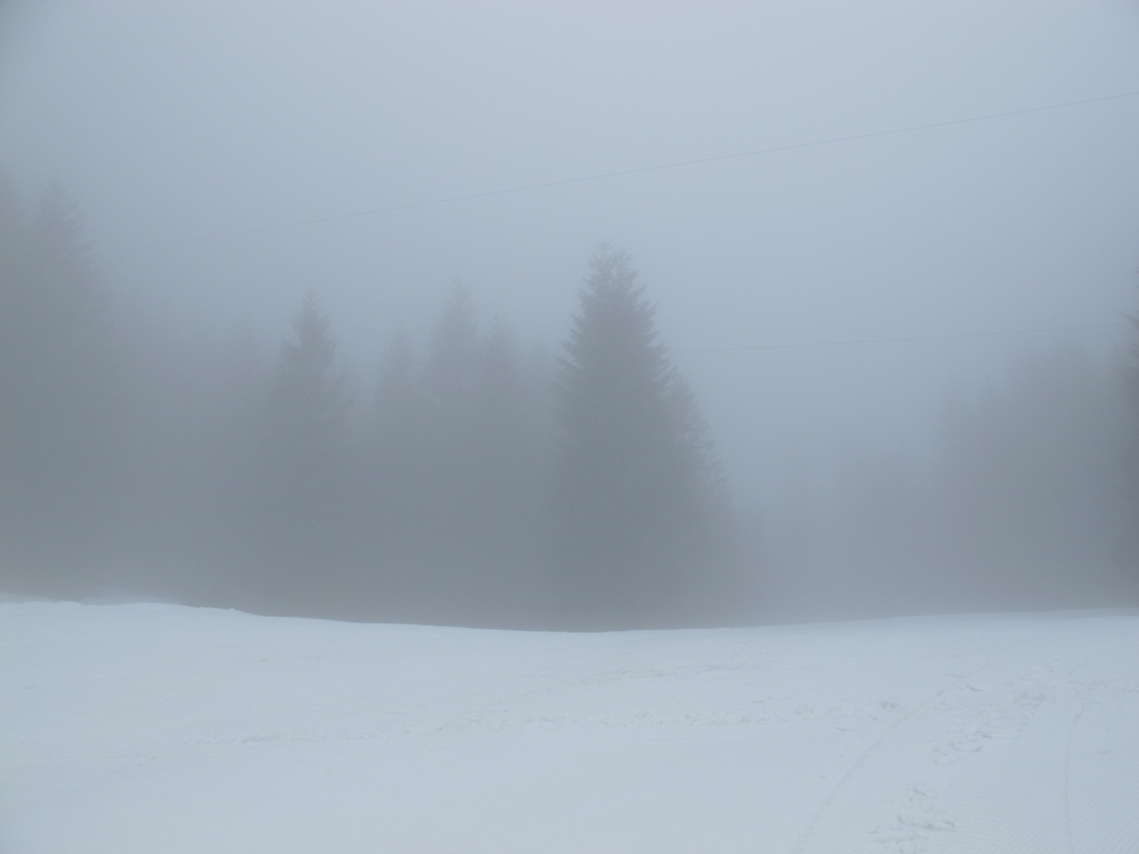 The higher I get, the denser is the cloud around my head. I think of the endless possibilities offered by the logics of quantum electrodynamics, and from all options I choose my favourite scenario: Arriving at the Kolbensattelhütte, there will be deckchairs with woollen blankets and a bar will offer hot caipirinha for 1,-€ per glass. The air will glisten with frozen fog while the sun breaks through the clouds and enfolds a wonderful Alp panorama. Entirely motivated, I continue uphill in recordsetting pace, reaching the chalet after 65 minutes.