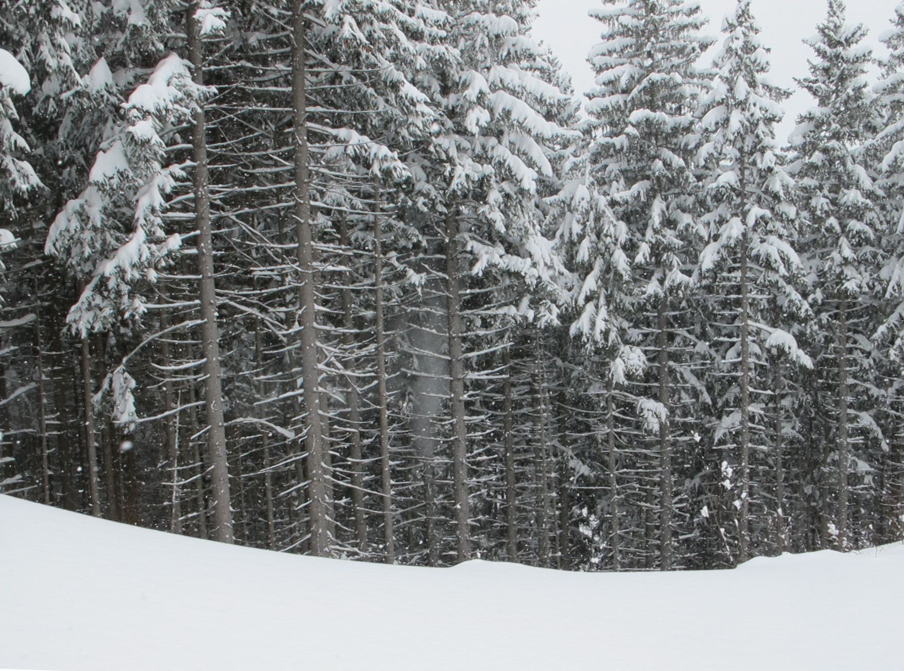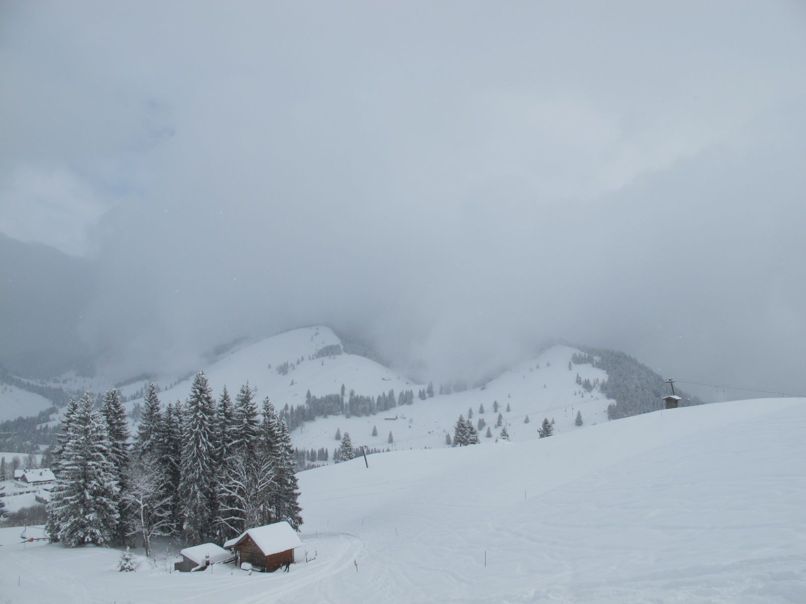 The descent is a dream of powder: fluffy snow up to our knees turns into pure joy. At least the joy kicks in once we have found out which direction is down. At first, it is hard to distinguish between the cloud and the snow. Cautously, we fumble down until we make it to an alternative ski trail and orient by means of voices and traces. As soon as we reach the timber line, we are back on track and enjoy the zig-zag through the deep white powder.