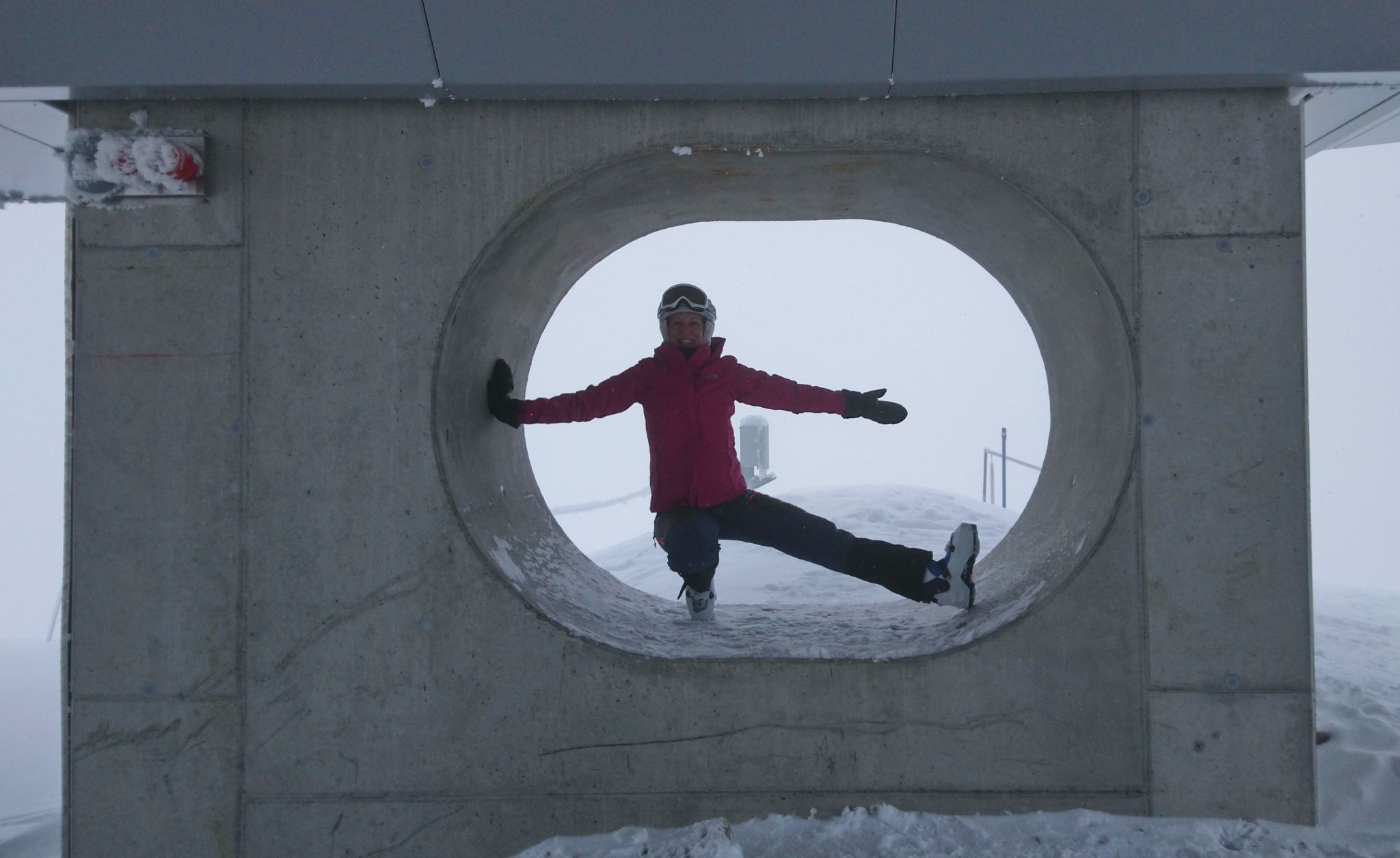 Due to -10°C and breezy snowflakes, we seek shelter at the gondola station. These days, no lift guard complains when tourists pose in the middle of it’s concrete walls.