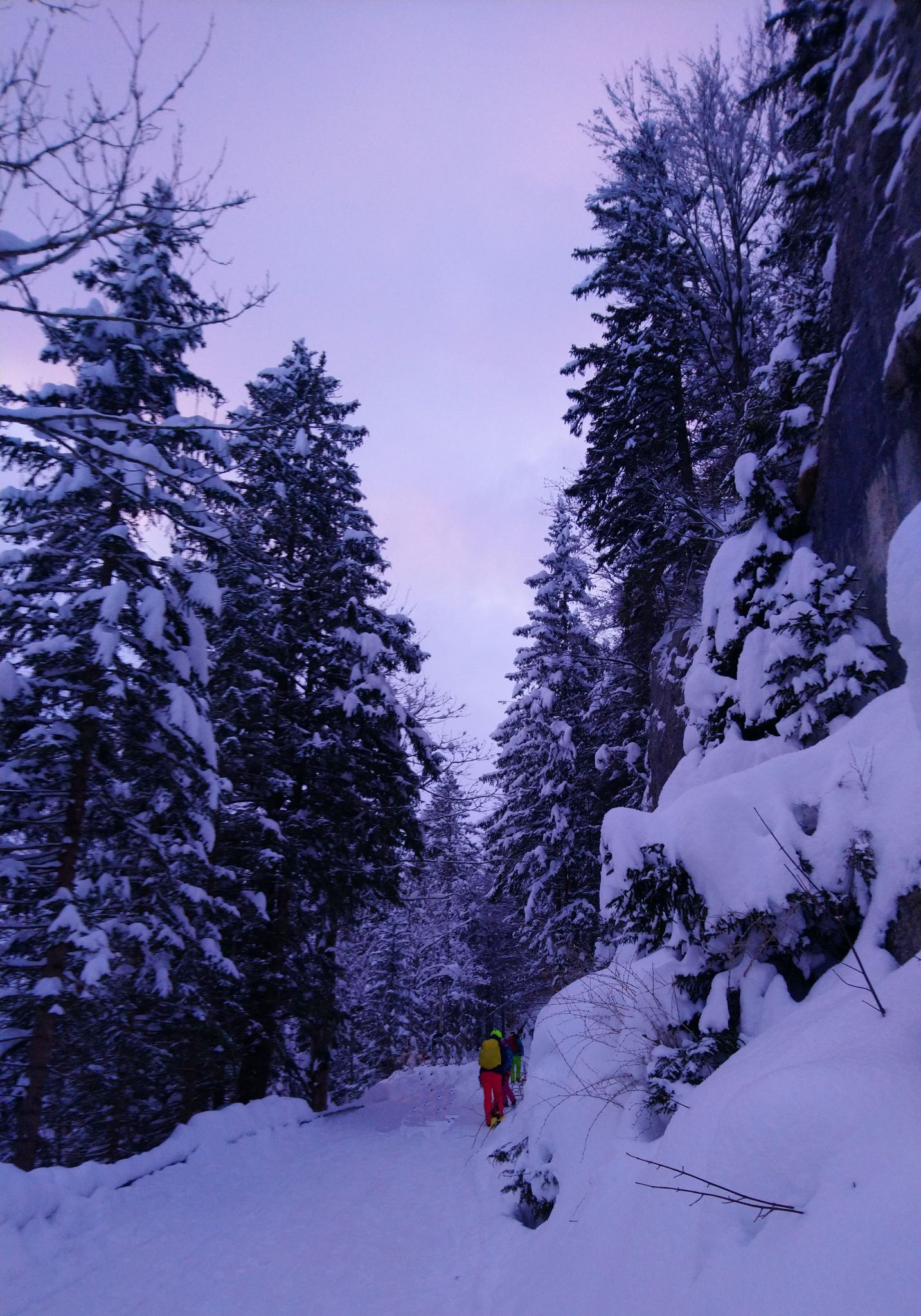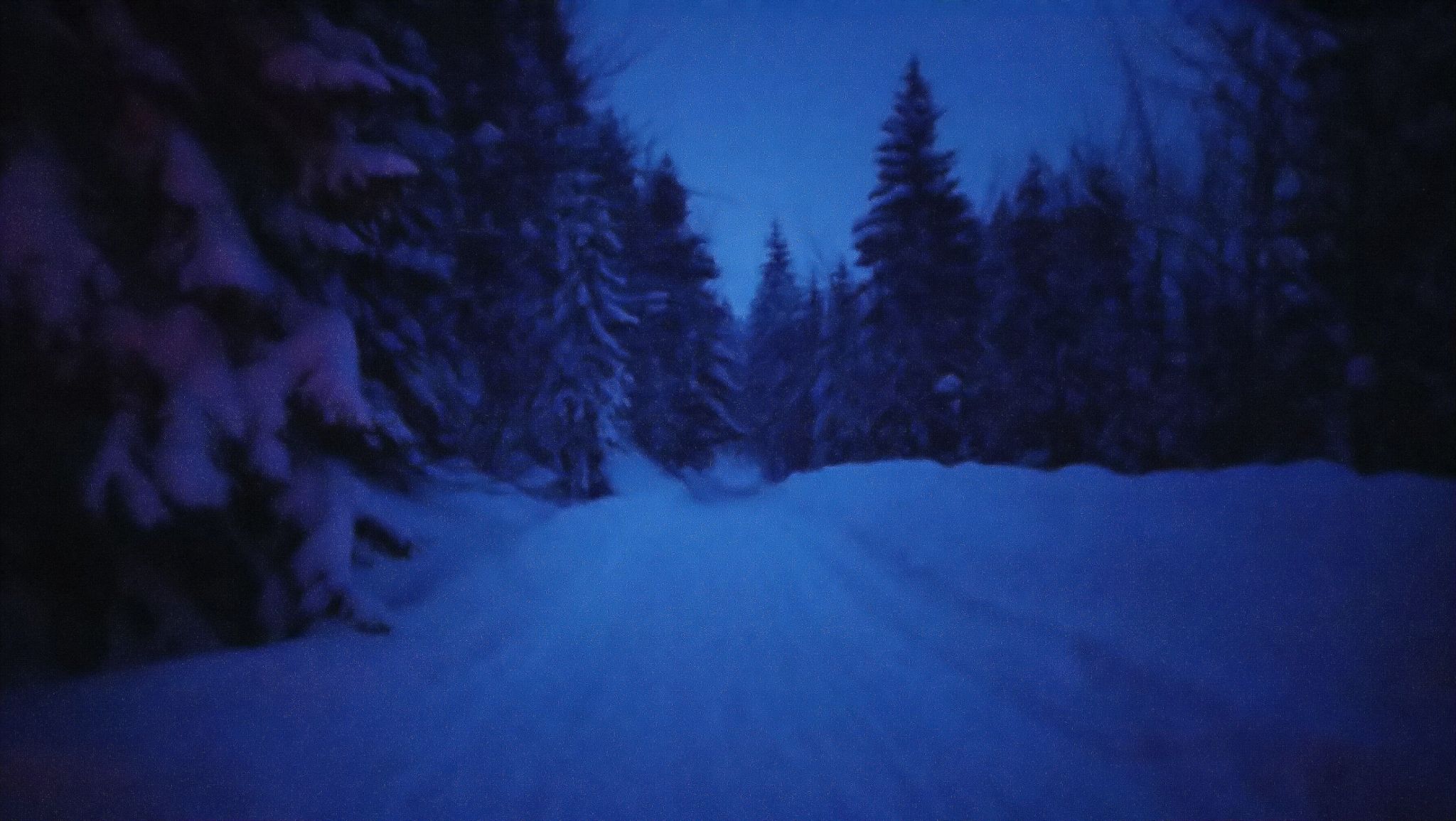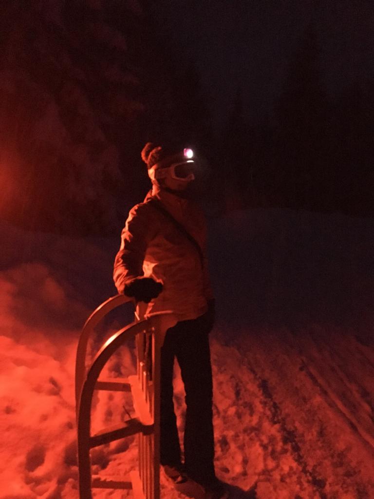 And then… Then the evening approaches and I find myself facing snow from all sides again. Star of the night is the sled I have found in the back of my basement. I pick up one of my sporty neighbours and, soon enough, we head for the mountains. Fading daylight and intensified snowfall make us stumble into a picture postcard scenery.