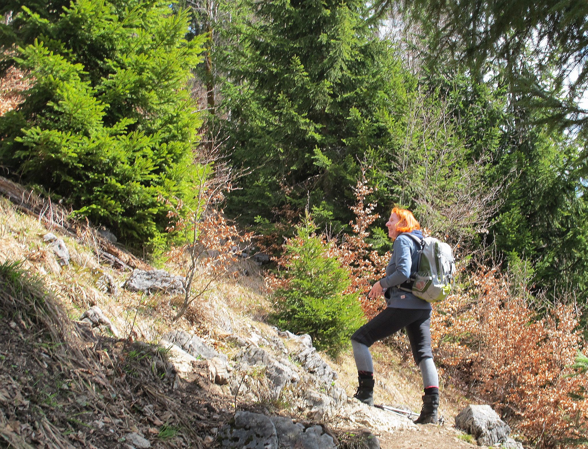 With the optional route via Kotalm being a bit of a bore, we rather take the ascent trails for our descent. It is a meet & greet with late risers and inappropriate equipment: fashion sneakers, loafers, out-of-breath slackers with a towel around their neck… Finally, all those couch potatoes have heard the call for sporty action, evidence to successful health insurance campaigns. Compared to those, we look like a female copy of the Huber Buam, up for any kind of alpine excursions.