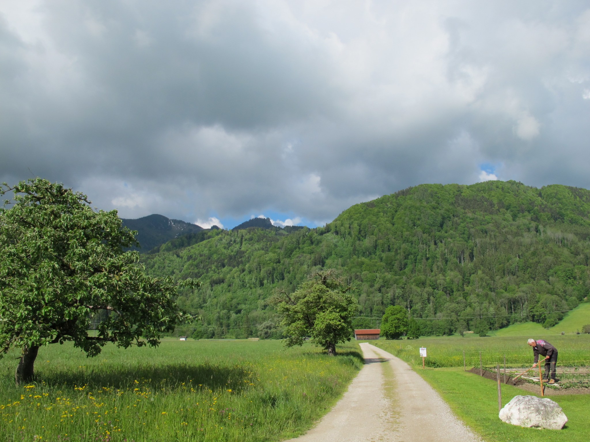 Weeks of rain have left the clouds white and empty, hence I put on my new hiking shoes and get going. I love the Chiemgau with its relaxed villages, and the friendly man I meet along the way proves me right. Meditation-like, calm and steady he takes care of his vegetable patch, greeting friendly while continuing his work. Yes, those who live here seem pleased with life and right they are.