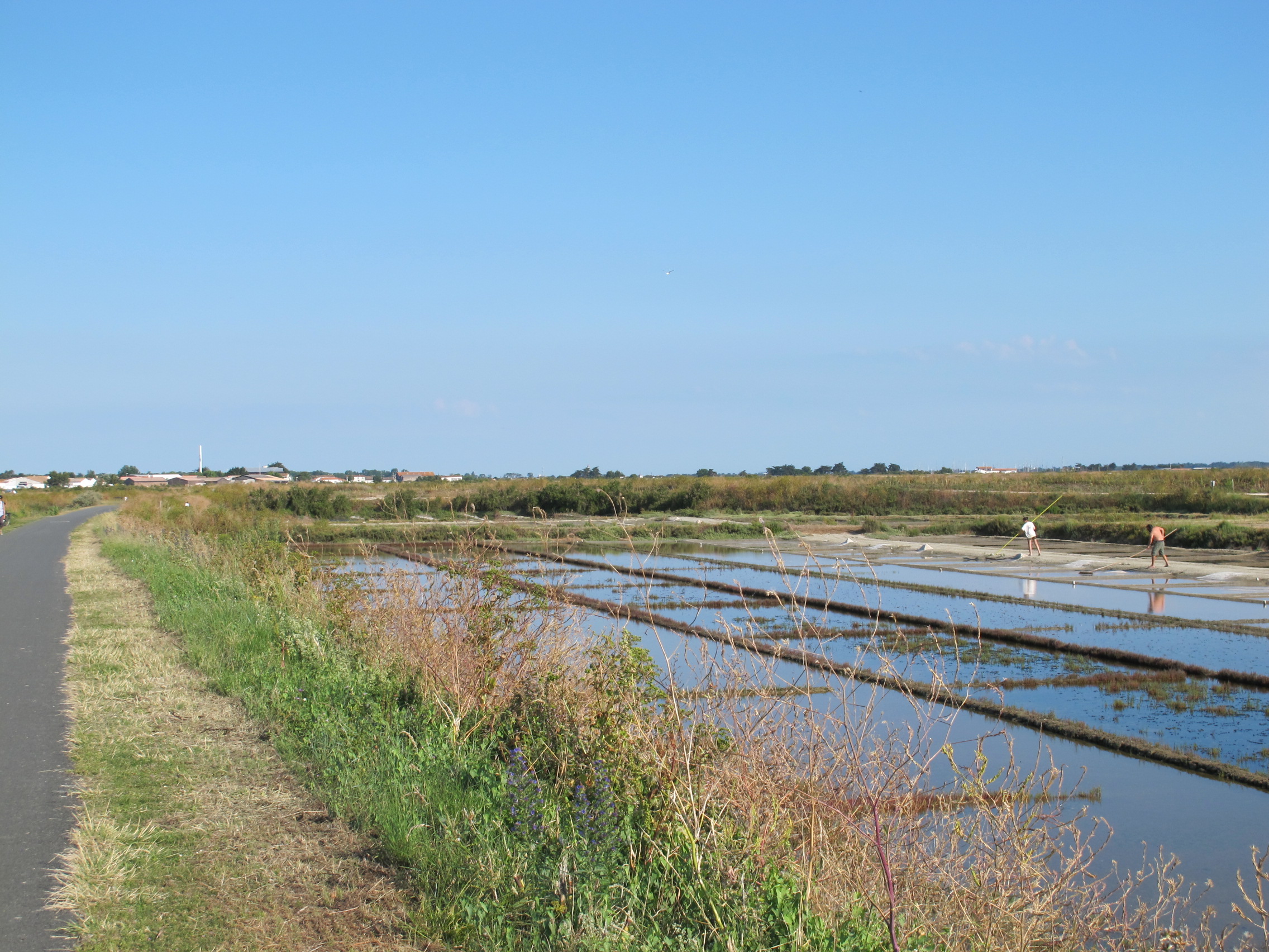 Île de Ré offers >100 km of pistes cyclables and I am willing to ride them all. Along the way, I pass by several salines = production fields for Fleur du Sel, the gourmet salt extracted from the sea. I dare say that the routine has not changed much in the last hundred years.