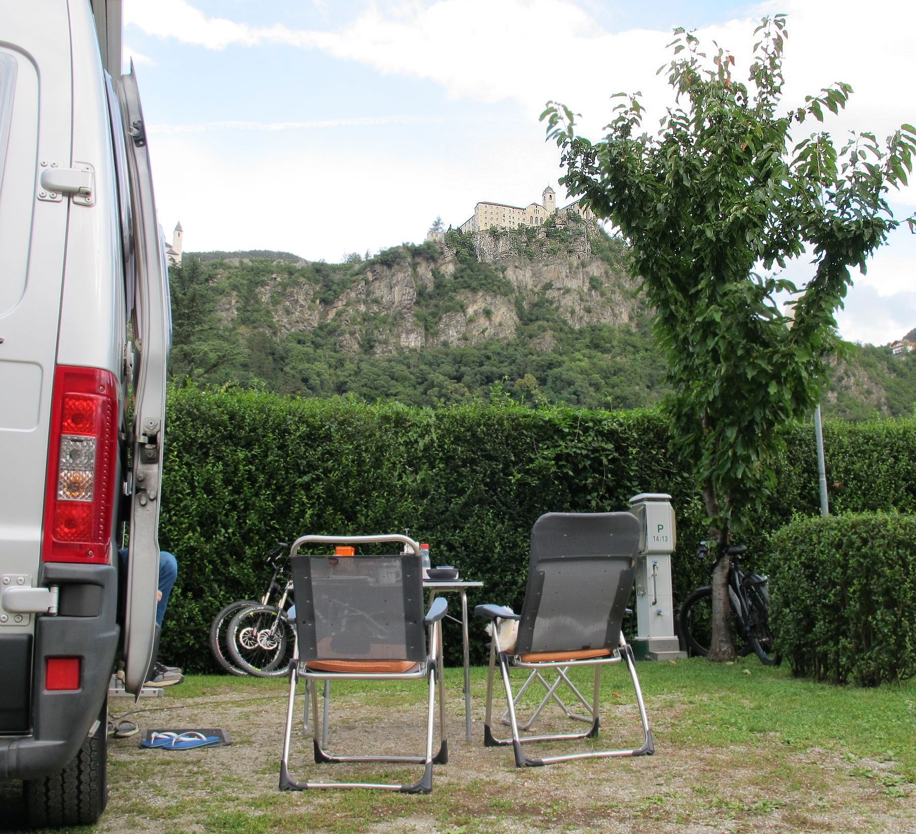 Other than Munich, the next morning in Klausen starts with blue skies, warm sun and a blocked bathroom door. The detail with the door is a bit disturbing. Not that I need Hector’s tiny bathroom when situated on a comfy campsite, but almost everything is stored in there: toothbrush, MTB equipment, sunscreen.