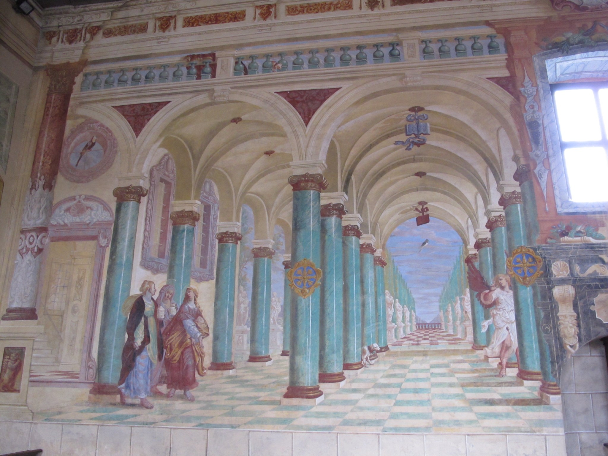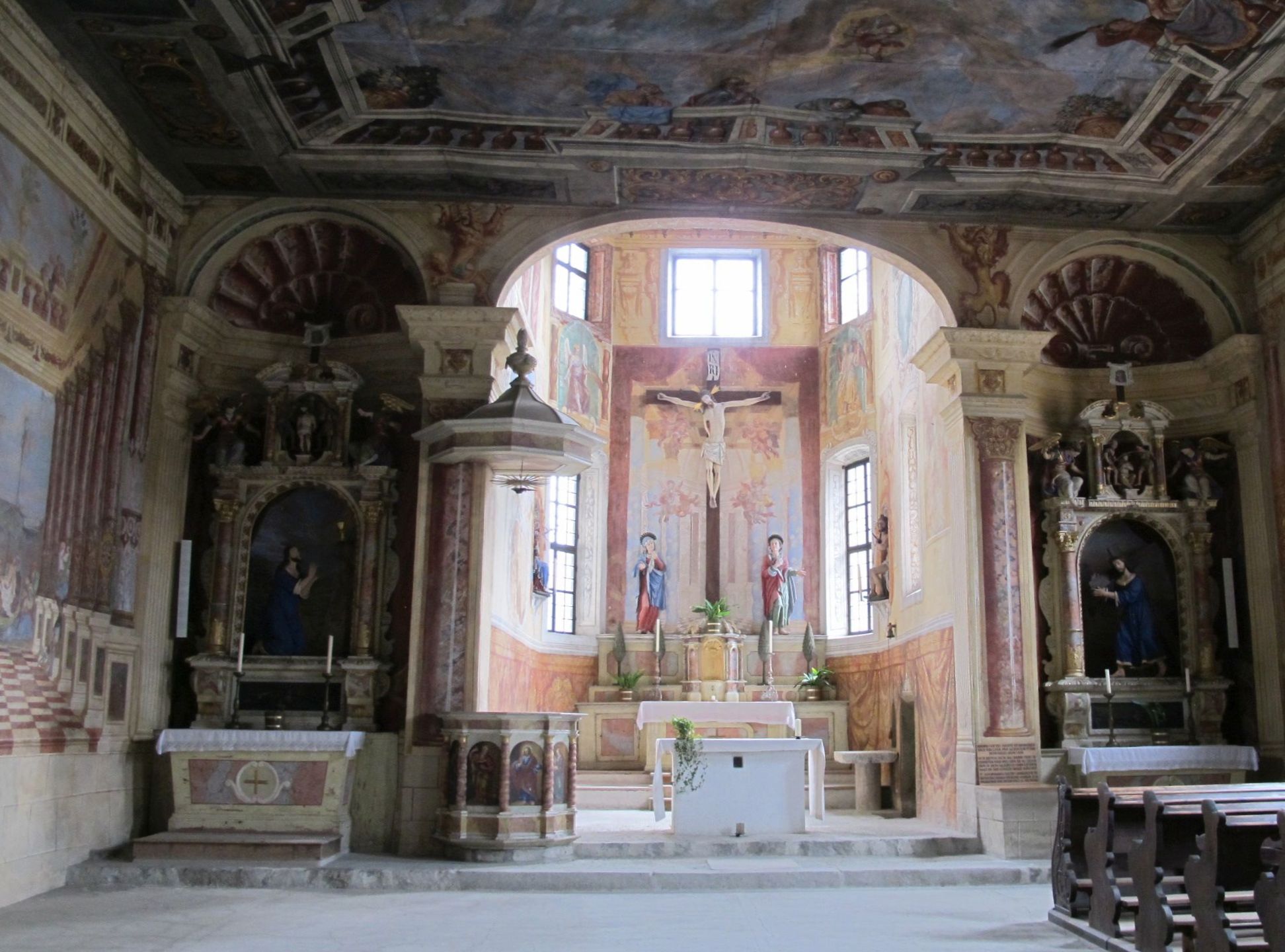 Huge wall paintings and the general atmosphere of the church are a surprise and a contrast to the fortress character of the area.