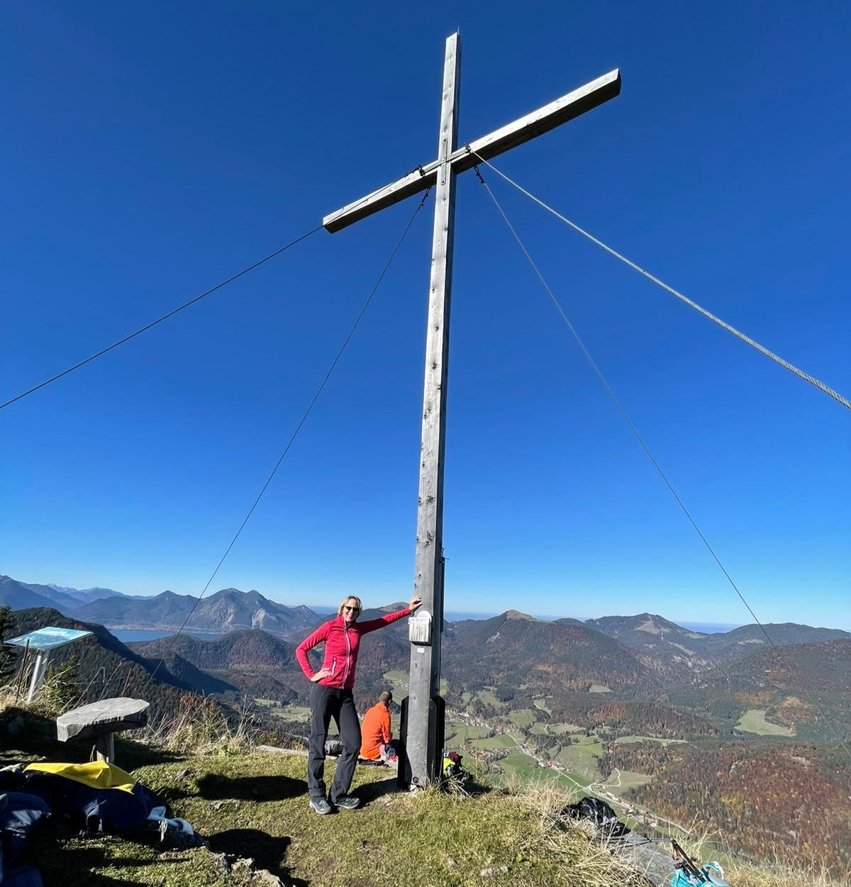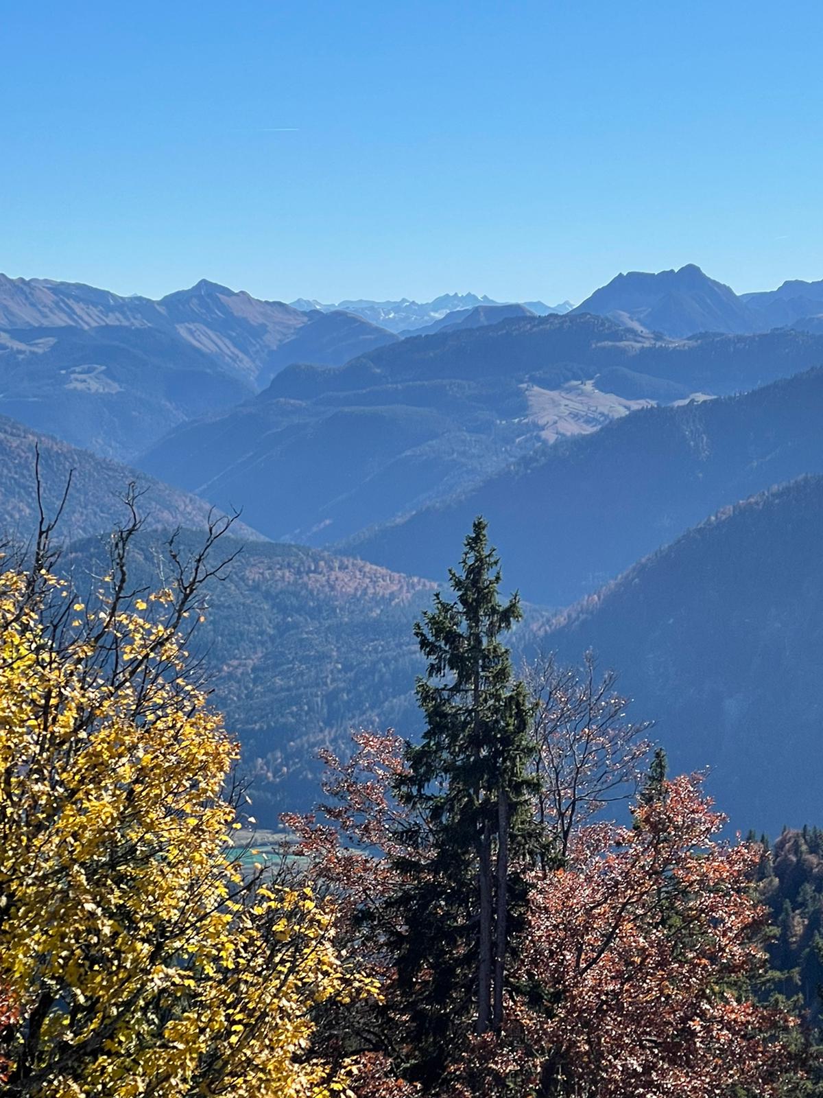 Typical for October, temperatures vary from frozen to t-shirt-warmth, depending upon sun and southern vs. northern flanks. The length of today’s tour, instead, depends upon orientation and rare road signs. We manage to sort out the first half just right, or at least most of it. Forest roads, paths and rare outlooks keep us busy and uphill for a bit less than two hours, until we almost stumble out of the woods and over the peak’s cross. Far from being the most impressive peak of the Alps, the Staffel’s cross is almost hilariously huge.
