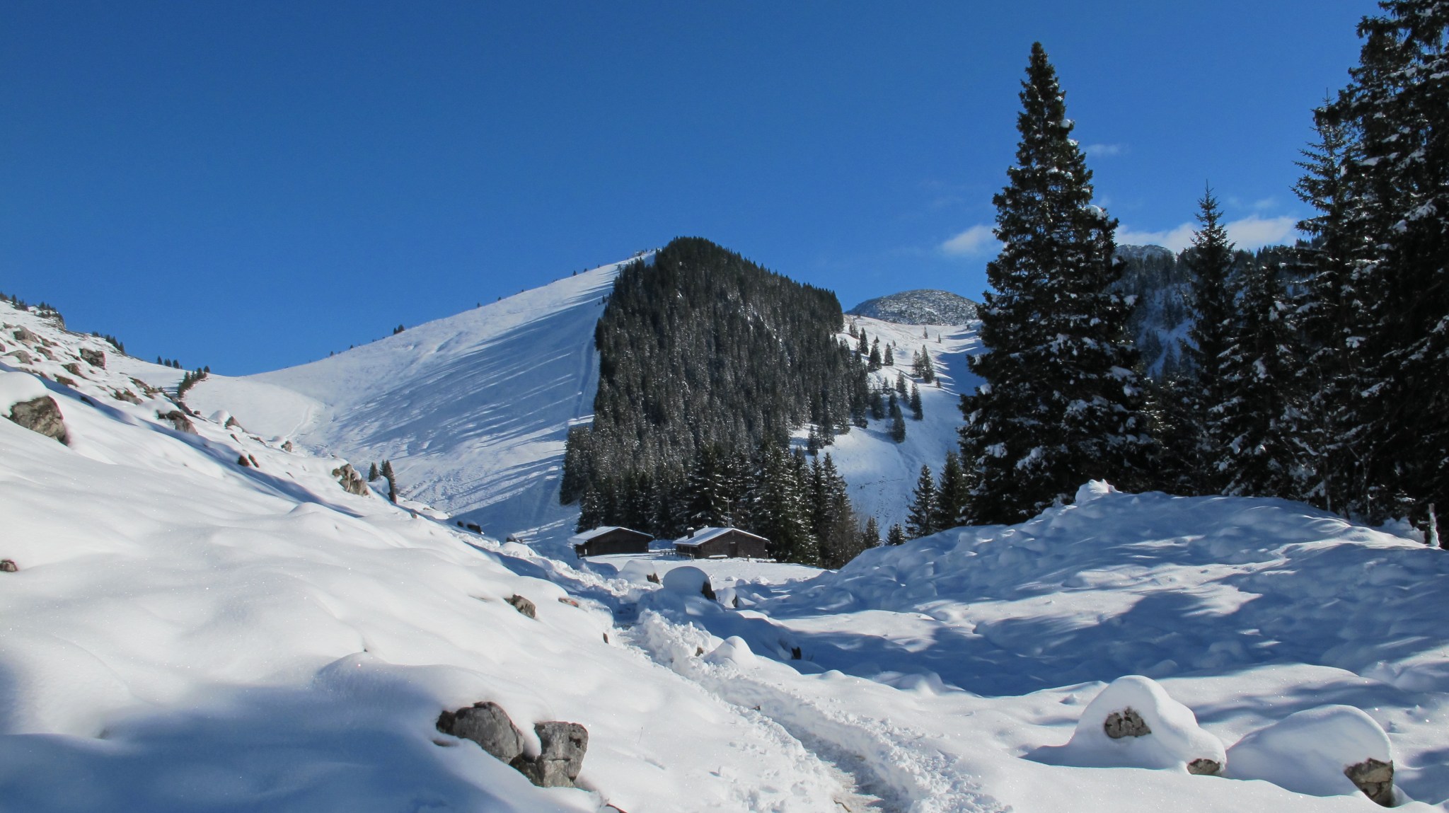 The forest path of the first passage is well marked and supposed to be my retour. Still, it brings me closer to my desired destination, the Jägerkamp-peak. It’s cross becomes visible as soon as I leave the forest behind and approach the Schönfeldhütte. There even is a sign towards a vague direction “Jägerkamp: 1h”. Half an hour later, after some back and forth trials, I realize: a) that I have reached a point only 5 minutes away from the Alm. And, b), that landmarks or painted dots (signposts) are buried under 30 cm of finest fresh snow.