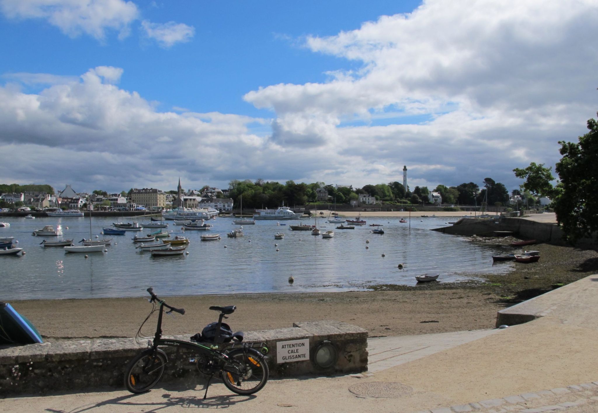 Motivated to use this day as much as I can, I hop on my folded bike and make it to Sainte-Martine. It is not even mentioned in my travel guide, but offers a handful of picturesque houses and two cafés around the sleepy port. From a more practical point of view, it is ideal as it offers a tiny ferry that takes pedestrians and bikers over the fjord-like water to Benodet (and from there, further on). Sitting on a table close to the ferry quay, I enjoy a coffee while waiting for the boat.