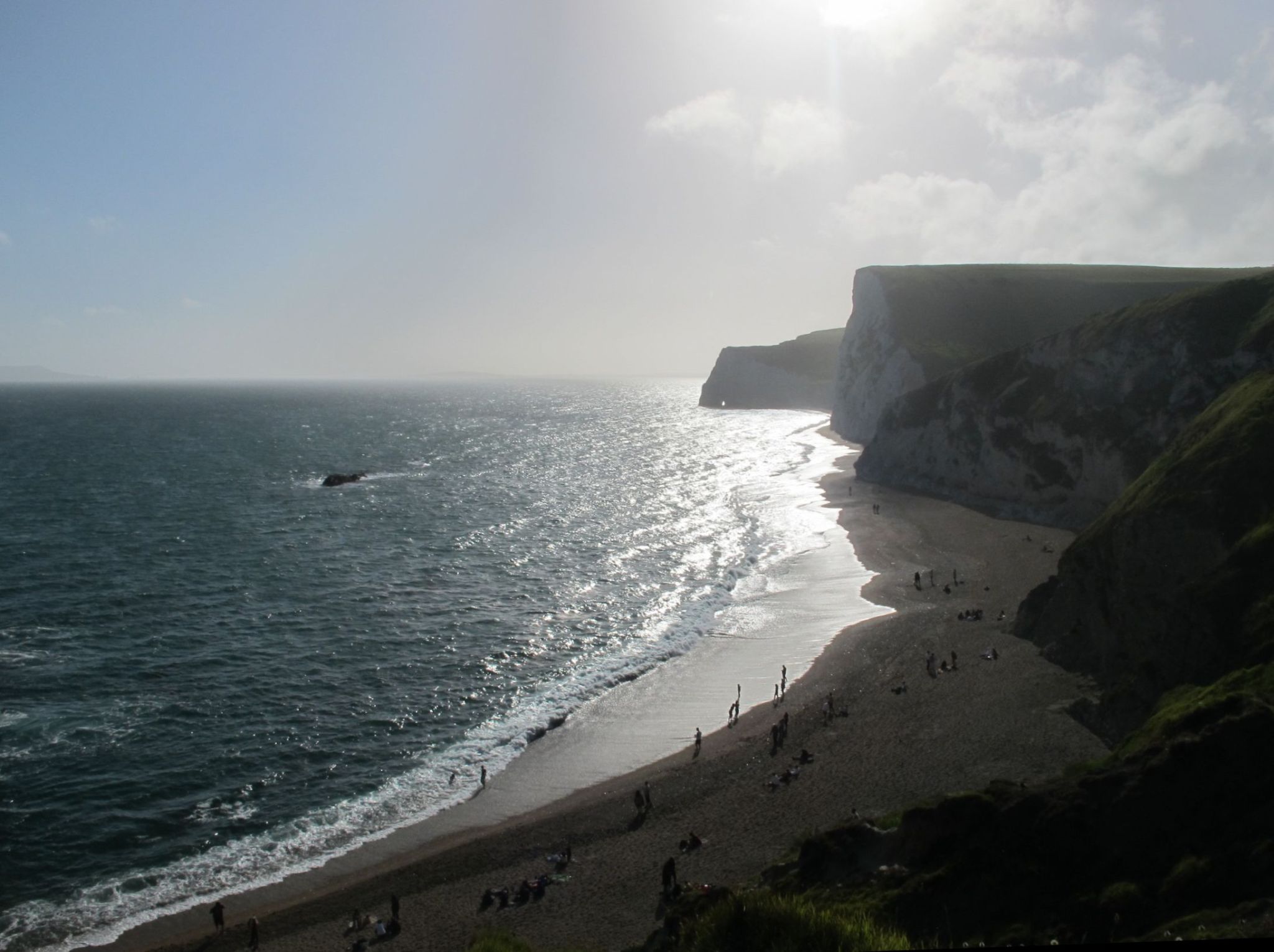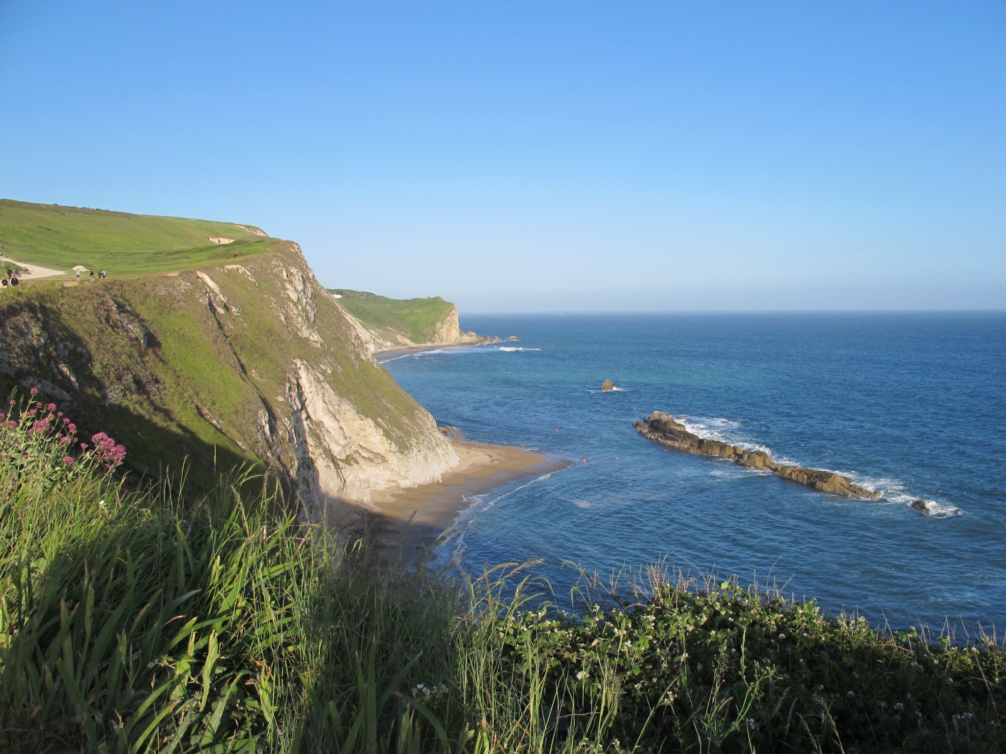 Die Jurassic Coast ist ein Glücksfall in unserer spontanen Reise-Entwicklung. Weiße Steilküsten, grüne Wiesen, blaues Meer. Im Gegensatz zu Cornwall, wo jede Ortschaft in Küstennähe ziemlich verbaut ist, gibt es in Dorset hübsche historische Dörfer, garniert mit Küstenwanderwegen.