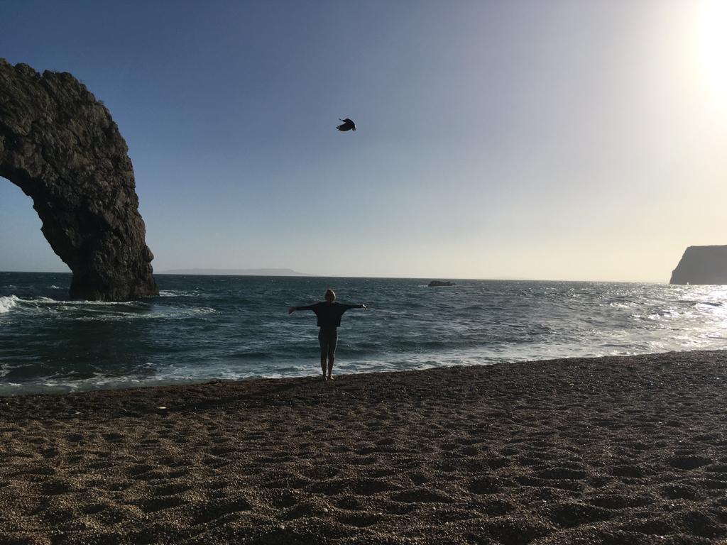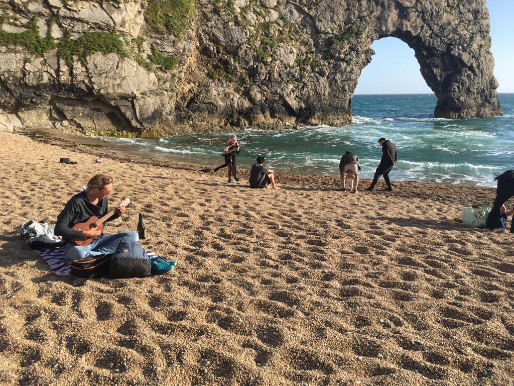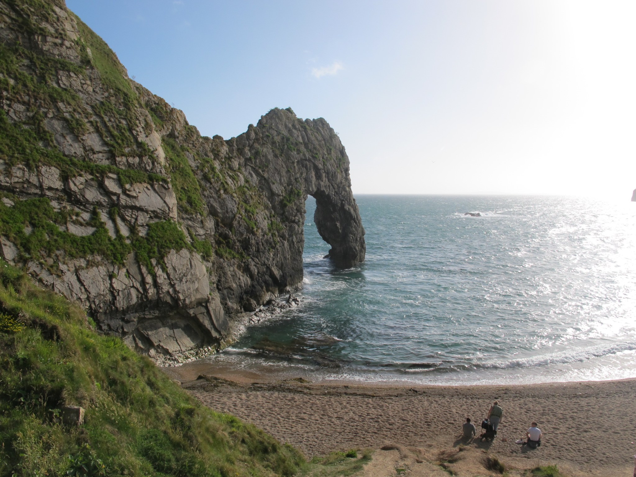 Sensationell schön. Und irgendwie unerwartet – wer ahnt schon, dass Reisezeitschriften-Bilder der Realität entsprechen. Dank des überfüllten Tintagel-Campingplatzes landen wir an einer Bucht in Dorset. Der Kiesstrand ist einladend und dann ist da noch das “Durdle Door” Felstor, das ein Barock-Künstler nicht schöner hätte malen können.