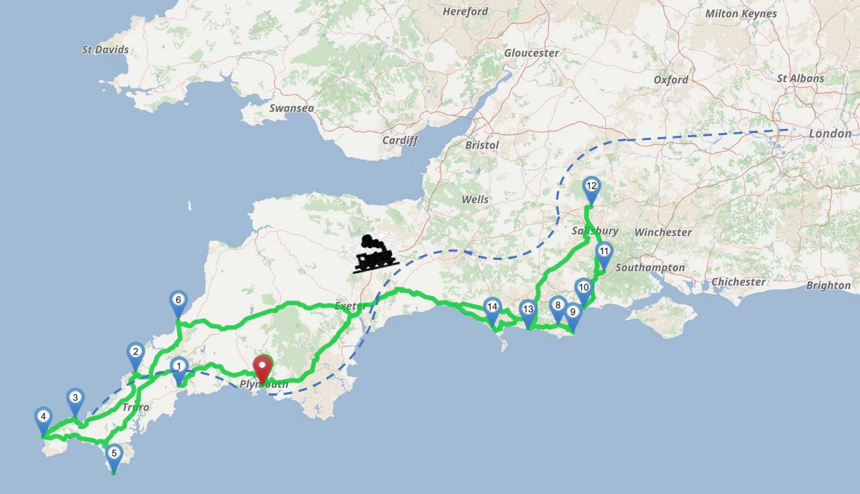 Insgesamt hatte ich bzw. hatten wir 1,5 Tage Regen in drei Wochen. Entsprechend sieht die Route aus, mit lustigem Zick-Zack zwischen St. Ives, Lizard Point, Tintagel und Durdle Door. Mehrstündige Fahrten durch Cornwall sind mit dem pummeligen Hector etwas anstrengend, aber machbar. Die Klappfunktion der Seitenspiegel war mehrfach Gold wert!
