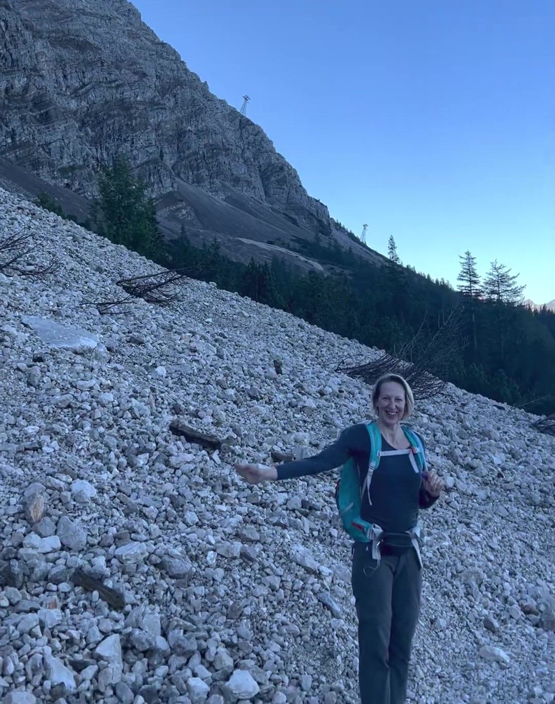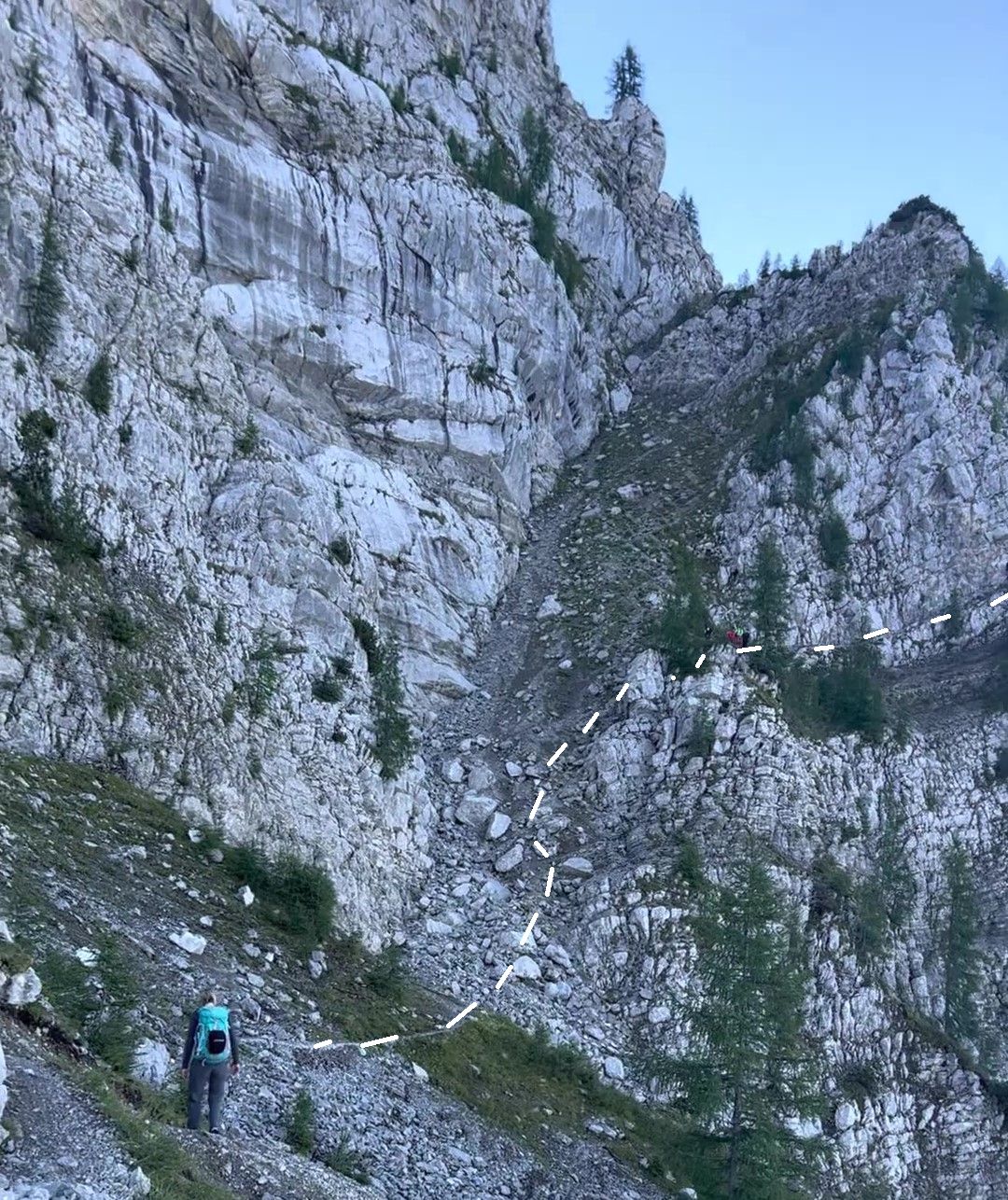 Wir packen zusammen und queren das Schuttfeld, dass einst ein 365-Tage-Schneefeld war. Im September 2022 ist von Altschnee keine Spur, und 15 Minuten später starten wir behelmt in den Korkenzieher-ähnlichen Steig.