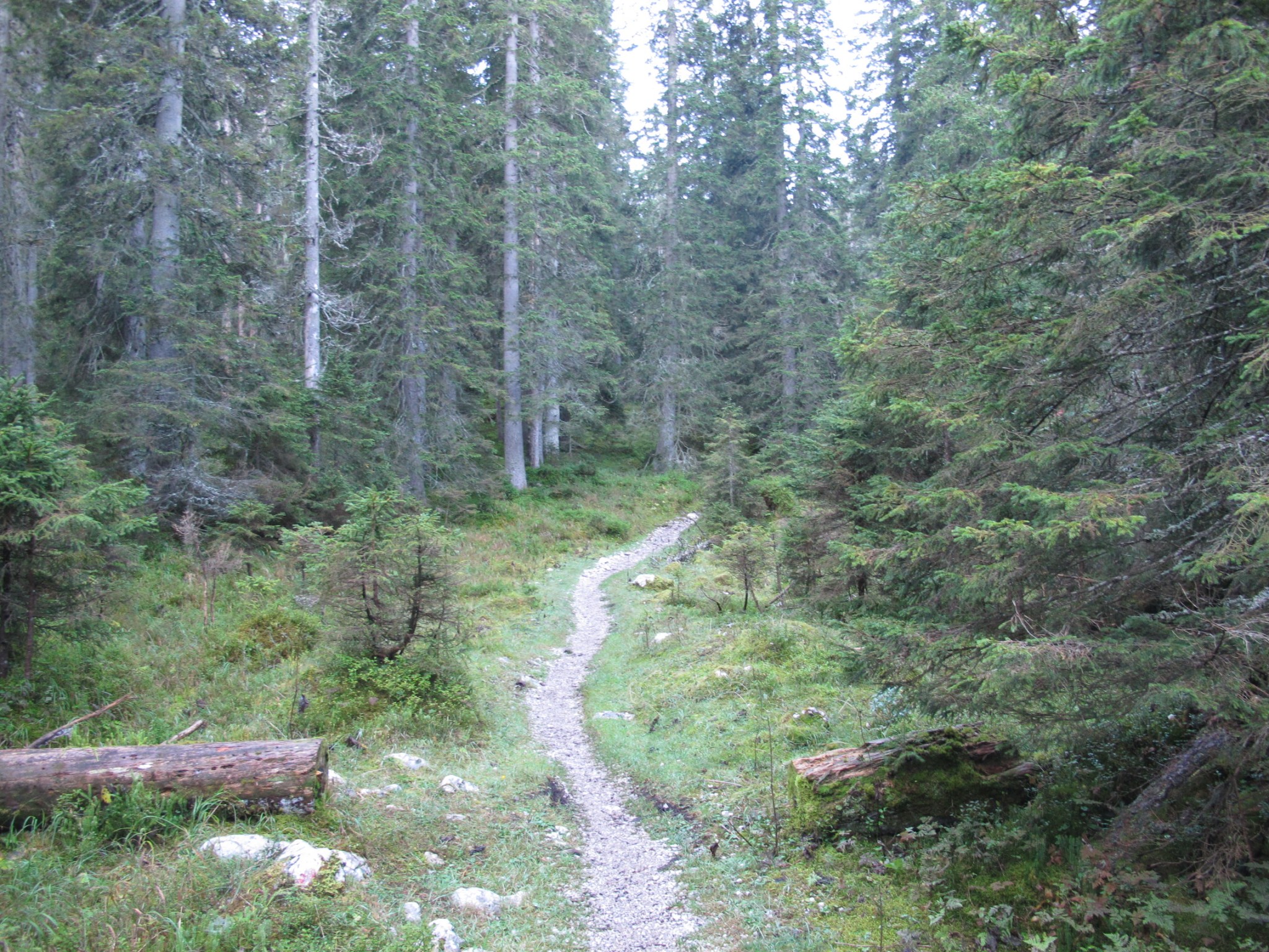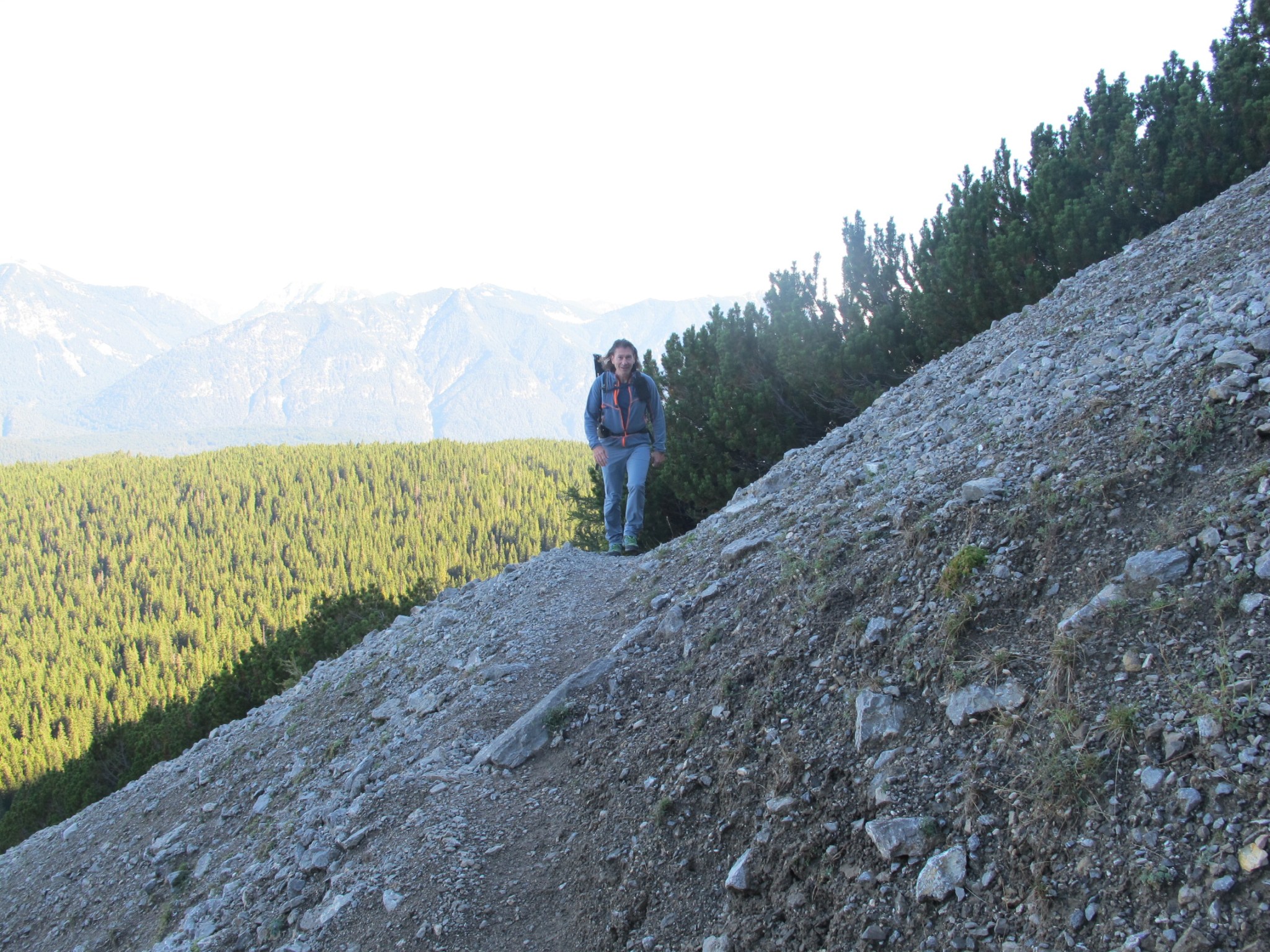 Während der ersten Stunde sind wir komplett allein. Und was für eine schöne Strecke wir haben! Schmale Pfade durch lichten Wald, Geröllfelder und schmale Steige, die sich an die steilen Bergflanken schmiegen. Höhenängstliche gehen manche Passagen womöglich mit weniger Vergnügen, und doch ist der Weg ganz wunderbar.
