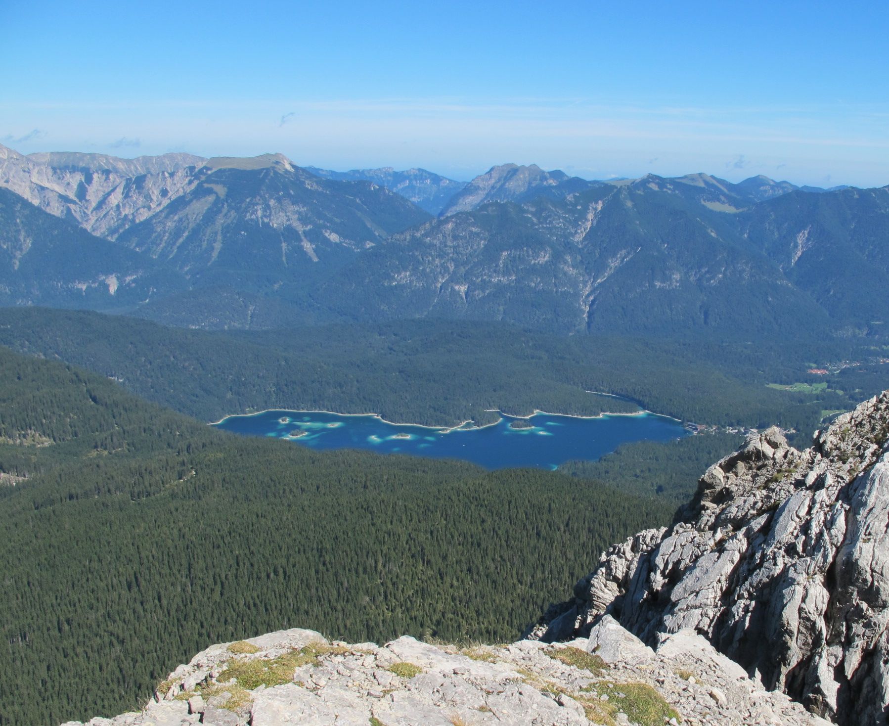 The track leads through light forests, contains views towards Eibsee, passes gravel fields and clings tight to the steep, rocky flanks. It might be too much of the sheer mountain massif for people with vertigo difficulties, for all others it is splendid.