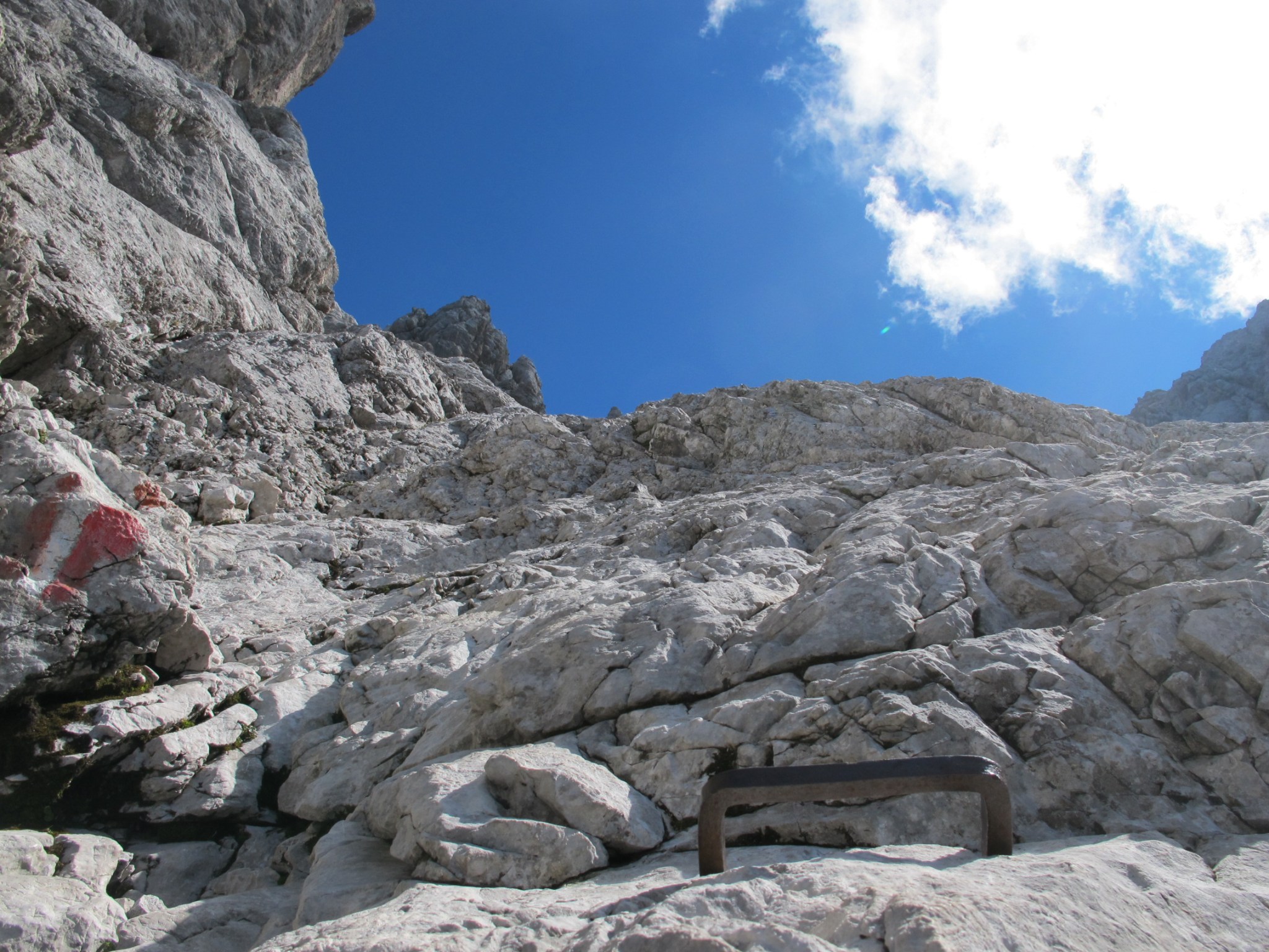 Der Durchstieg im ersten Teil der angelegten Route ist nicht schwierig, aber lustig und irgendwie besonders. Anschließend geht es vor allem bergauf, es folgt Eisentritt nach Eisentritt. Zum Glück sind die Jungen Wilden vor mir gut drauf und lassen mich vorbei. Seit Tagen schon bin ich nervös und hoffe inständig, dass ich den Aufstieg bis zum Gipfel schaffe, und das gelingt am ehesten im eigenen Berg-Rhythmus. Kann ja keiner ahnen, dass ich heute den Wandertag meines Lebens habe.