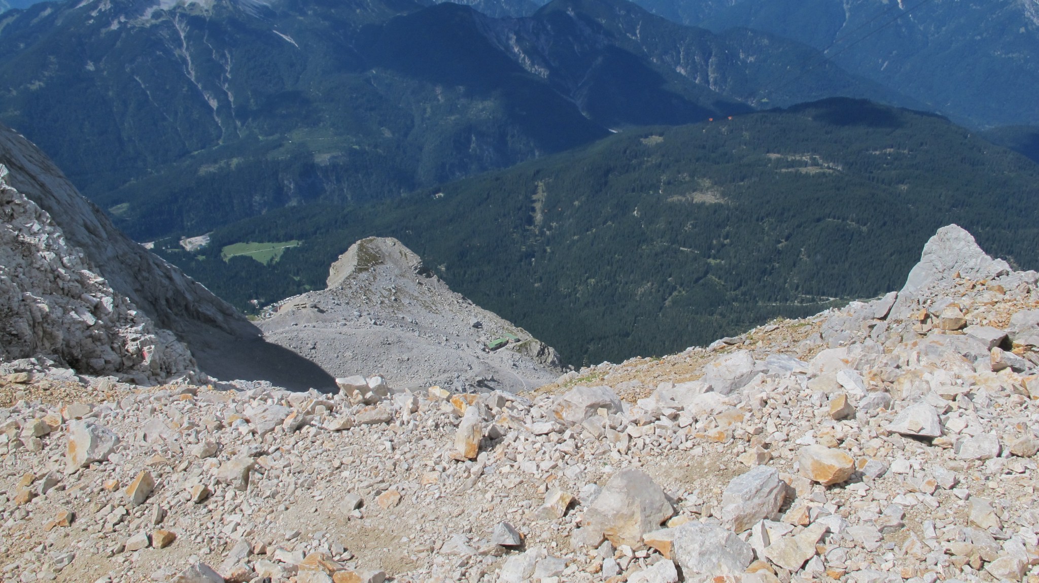 Die Entfernungen (Rückblick Hütte, Ausblick Gipfel) sind wie eingefroren, aber die Perspektive in der Horizontalen verschiebt sich enorm. Weit unten liegt die Wiener Neustädter, während die abgebrannte Station der alten Ehrwalder Seilbahn oberhalb unserer Köpfe erscheint und in greifbare Nähe rückt. Das Klettern hat nun leider ein Ende, stattdessen kündigt die gelbliche Färbung von rutschigem Untergrund.