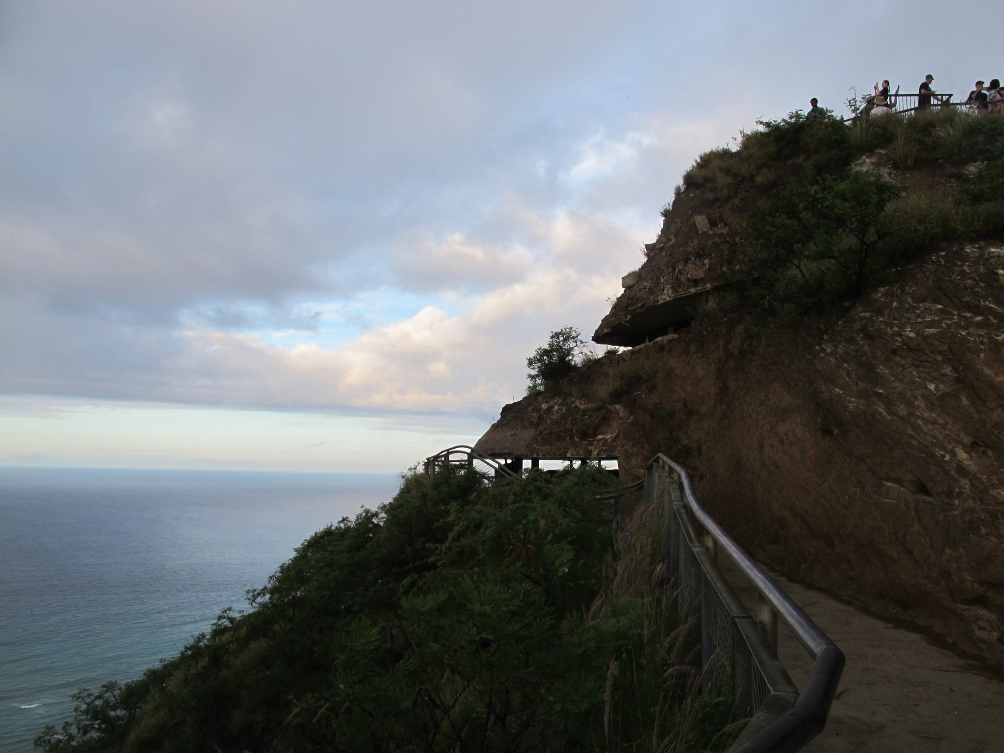 Gute 90 Minuten brauche ich bis zum Tunnel, der ins Innere des Kraters führt. Von dort aus startet der eigentliche Wanderweg bis zum höchsten Punkt des Diamond Head (232 m). Für hiesige Verhältnisse ist der Aufstieg abenteuerlich: holprige Wege, endlose Treppen, Geländer nur auf einer Seite. Dazu unbeleuchtete Tunnelabschnitte und Natur in greifbarer Nähe. Der Wahnsinn!
