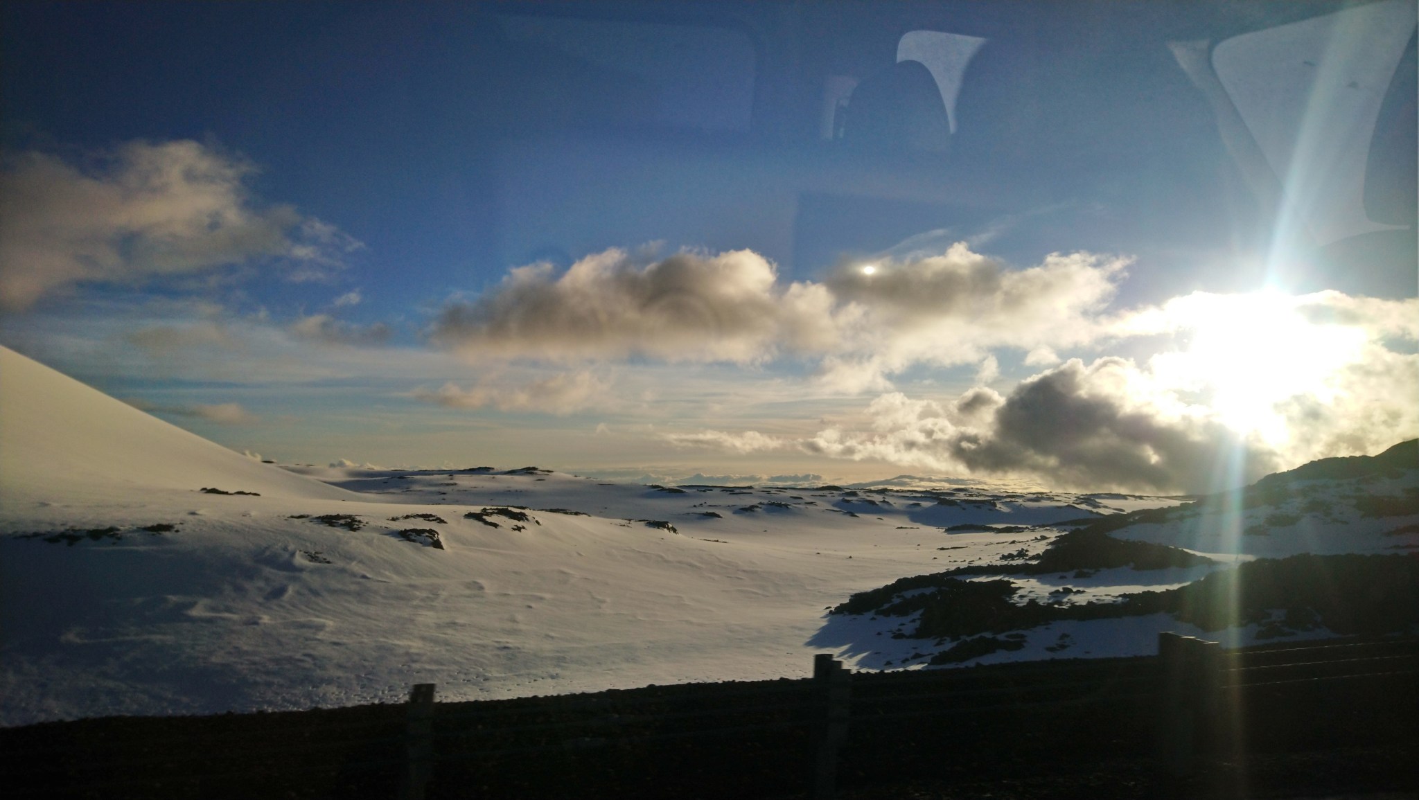 Zum Sonnenuntergang kommen wir auf 4.207m an. Von weitem ein flacher Hügel, aus Fahrersicht steil bergauf, mit wenig Asphalt und viel Lavasteinen unter dem Vierradantrieb. Oben dann -2°C und frischer Schnee.