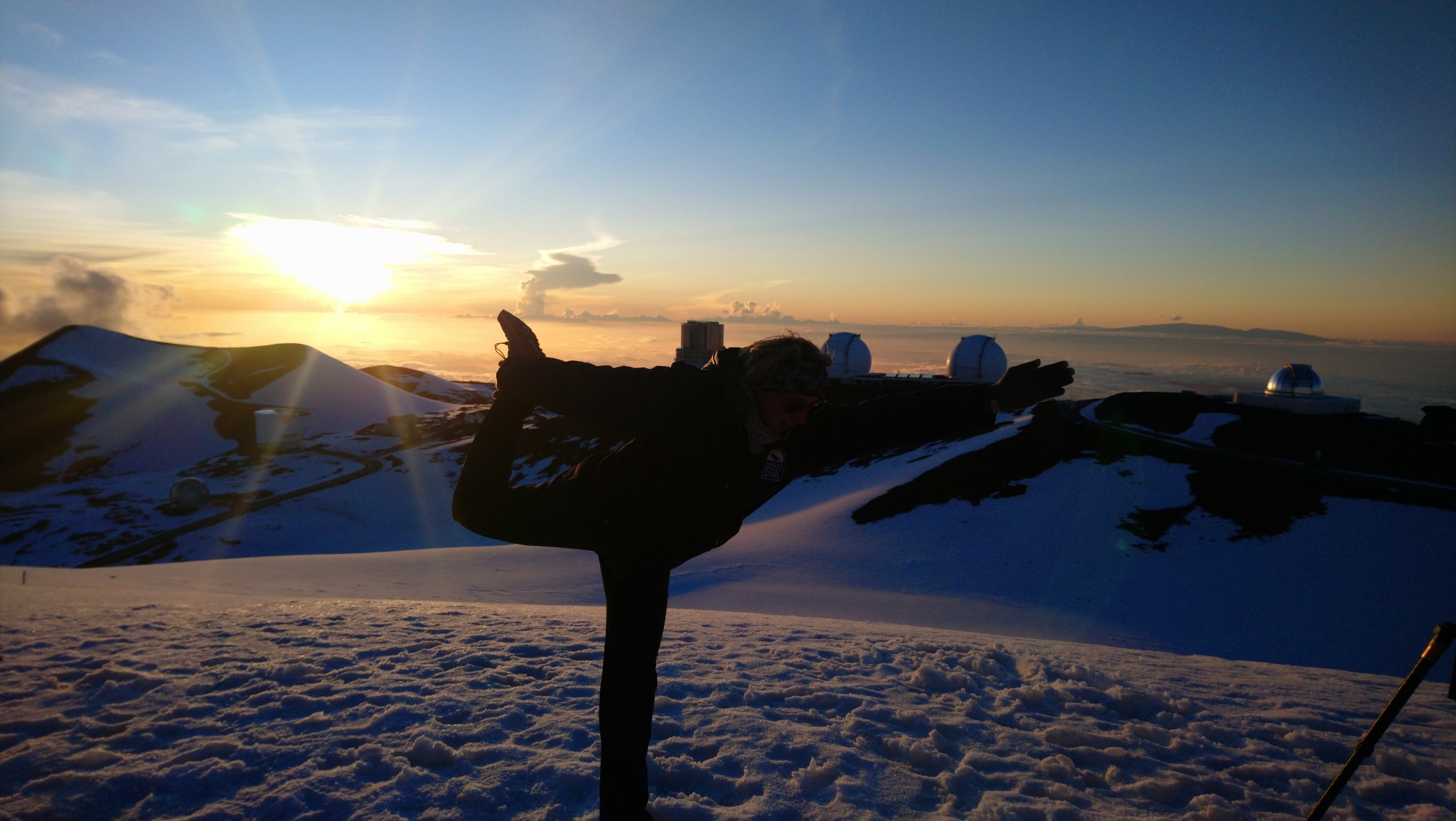 The dirt road ending on 4.207m is unexpectedly steep, not matching the look from a distance with Mauna Kea’s gentle silhouette. Perfect conditions welcome us for sunset with -2°C and fresh snow.