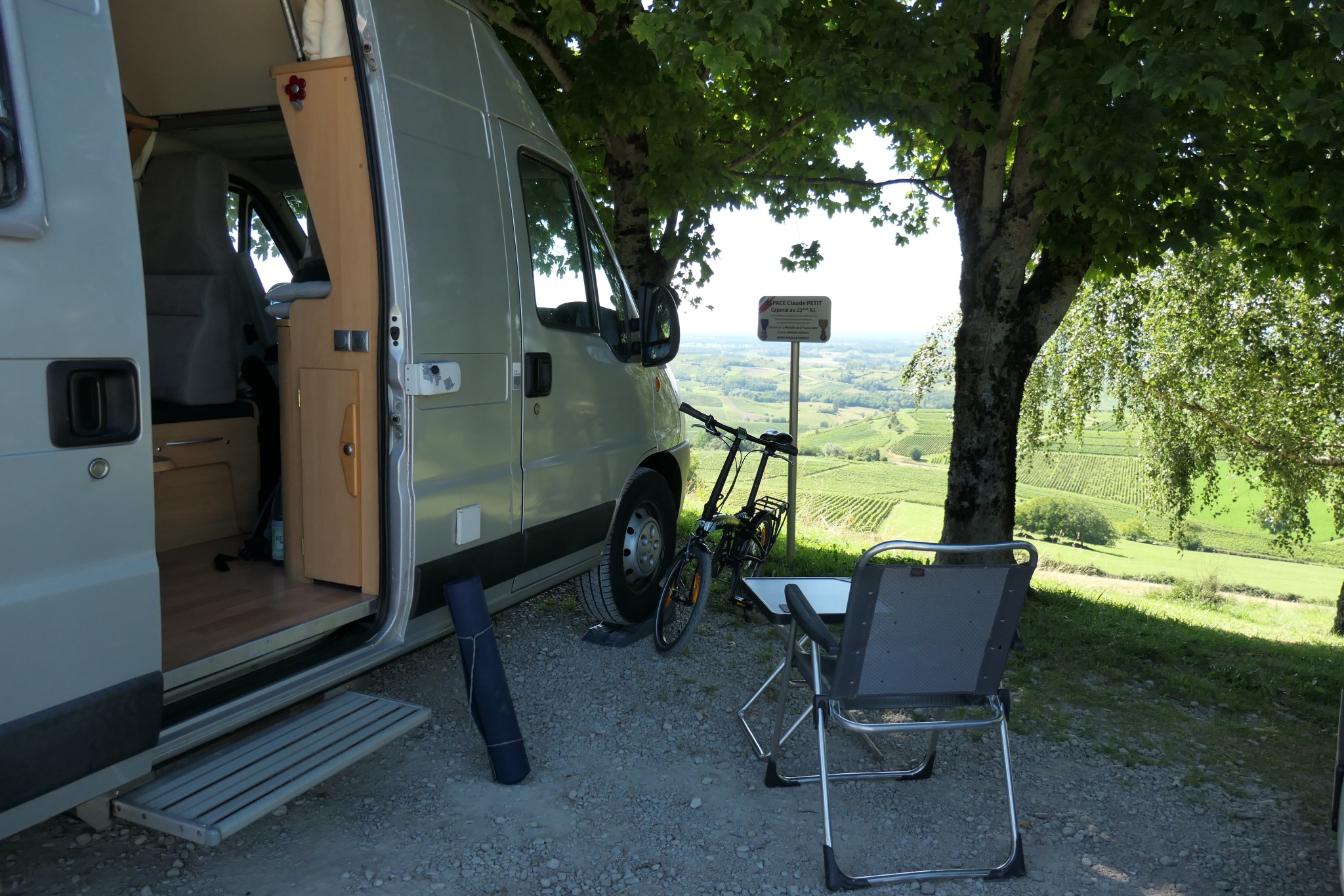 Ab Freitag starten wir durch, wir suchen und finden den Sommer im Jura. Die Gegend entpuppt sich als Juwel: Kaum angekommen in Pupillin drücken mir am Weingut fremde Menschen ihr Töchterchen in die Hand. Sie führt mich zum Belvedere-Parkplatz, den sich Hector sofort als Schlafplatz aneignet.