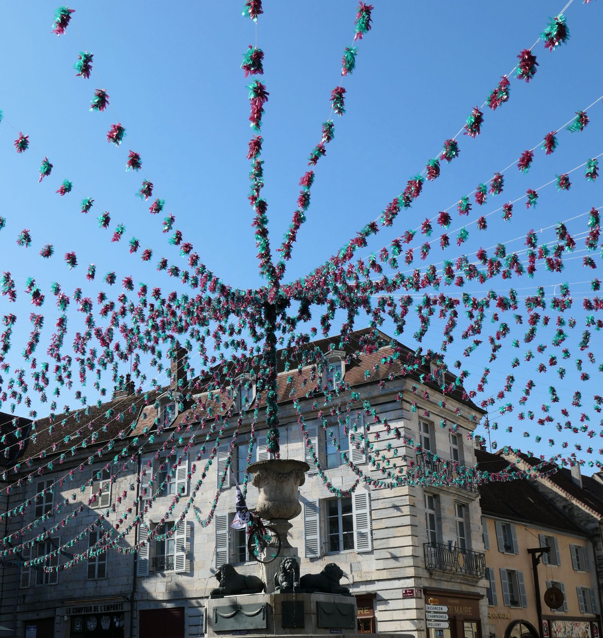 Die Ortsmitte kann man gar nicht verfehlen: bunte Girlanden überdachen sternförmig den großen Platz, ein bisschen wie ein Zirkuszelt mit Himmel.