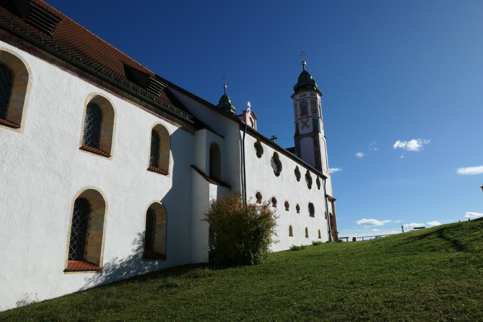 Ein idyllischer Aufstieg durch lichten Wald, schon liegt der Ort unter mir und die Ansammlung aus Kapelle, Doppelkirche und Ölberg / Golgathahügel vor mir. Als wäre das nicht beeindruckend genug, haben sie auch noch die Aussicht zum Karwendel obendrauf gepackt.