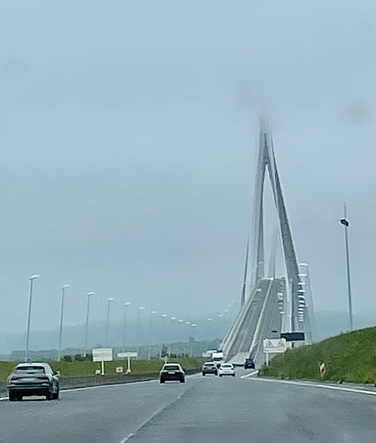 Die Brücke bei Le Havre kratzt an der dichten Wolkendecke: Heute ist fast egal wo, es regnet. Dabei sah es gestern Abend noch so gut aus… Hector duscht, ich kaufe ein (trotz Feiertag geöffnet: Ferme Cara Meuh), mehr passiert heute nicht.