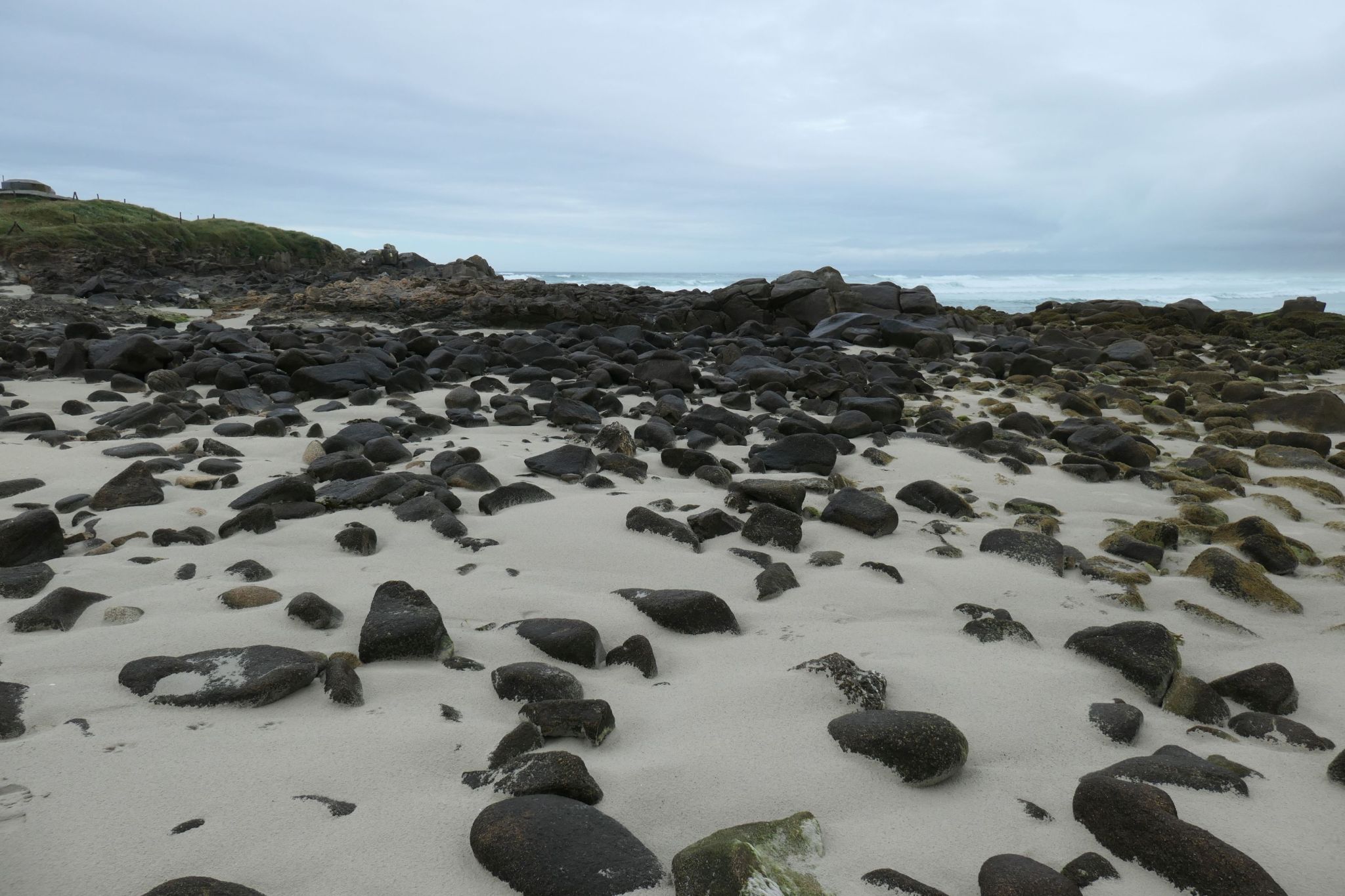 Heute gibt es mehr Brandung als Wellen, donnernde Brecher, die Surfern wenig Freude bereiten. Die Bucht ist von einer felsigen Landzunge unterbrochen, hier konnten sich die Gestalter nicht entscheiden: Felsenmeer oder Sandstrand? Es ist dann irgendwie beides geworden.