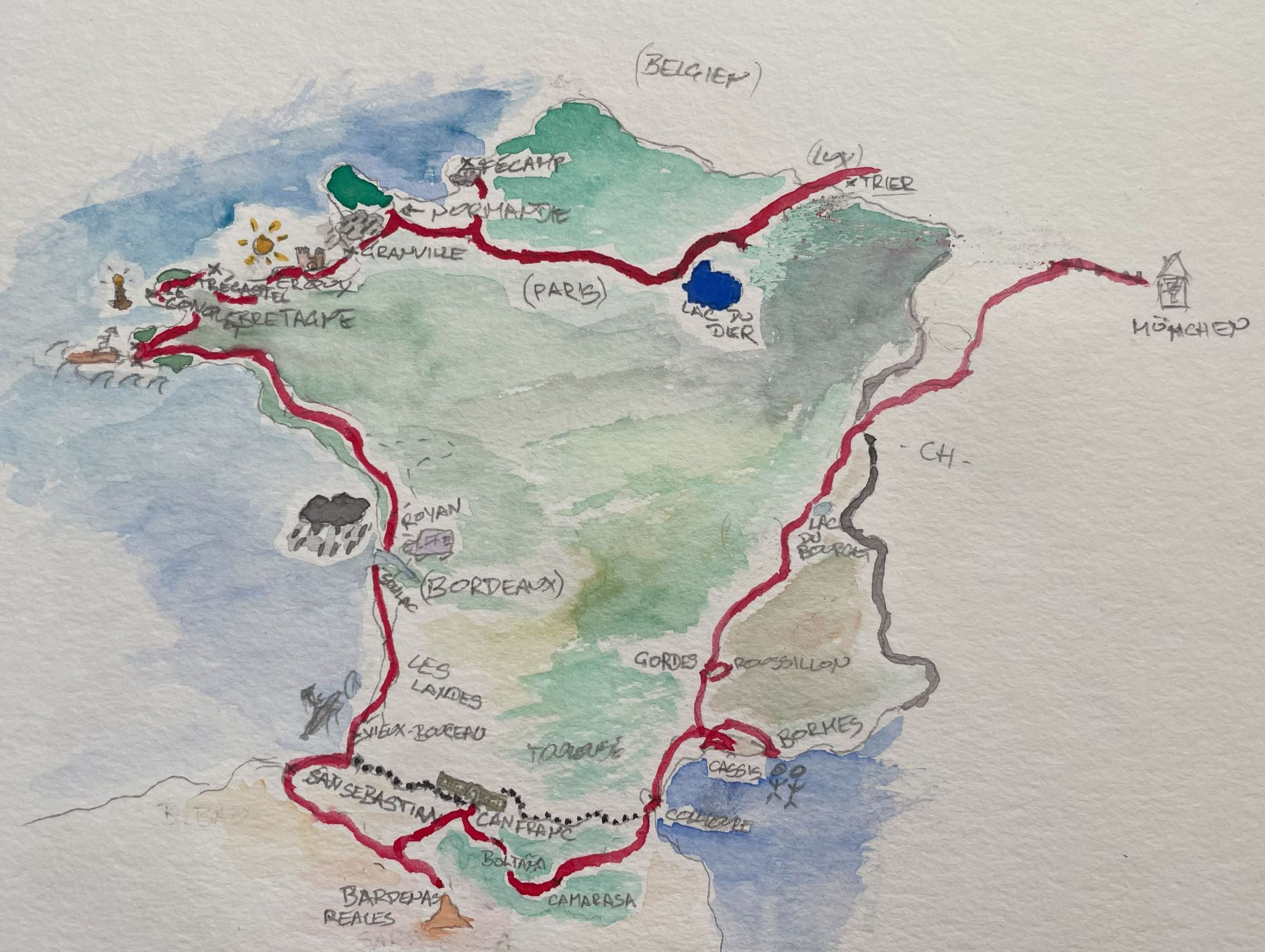 Exactly 56 days and 6.393 km after my departure, I get back home. Unloading Hector reveals an unexpected quantity of wine bottles as well as sun & summer weather for the upcoming weeks. A good base for new challenges and expeditions…