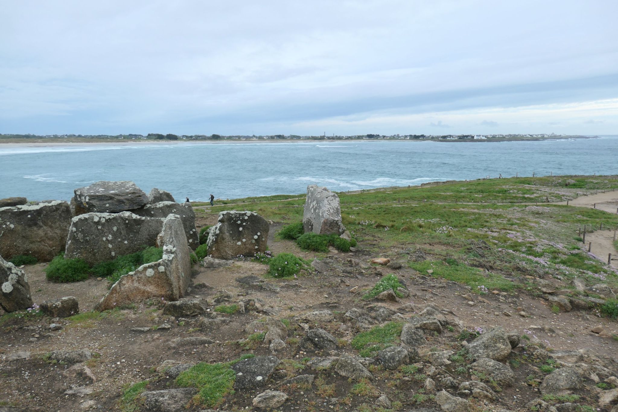 Licht, Wolken und Wind zeigen sich am südwestlichsten Punkt der Gegend äußerst variabel. Sobald der Himmel ein bisschen aufreißt, werden die Farben kräftiger und die Weite heller. Auch die Flechten und sonstigen Tupfen auf den Steinen des alten Hünengrabs wirken beinahe fröhlich.