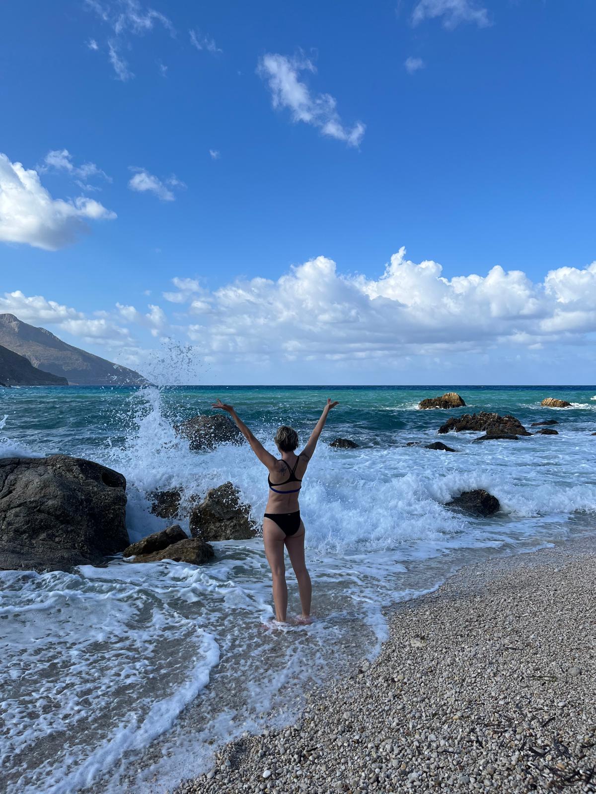 Ich übernehme den Rhythmus meiner Schwester, der mit aktiver Erholung startet: früh-morgens vor der Hitze eine kleine Runde laufen, dann ab ins Meer und an einer der kleinen Kies-Buchten sanft in der Sonne trocknen.